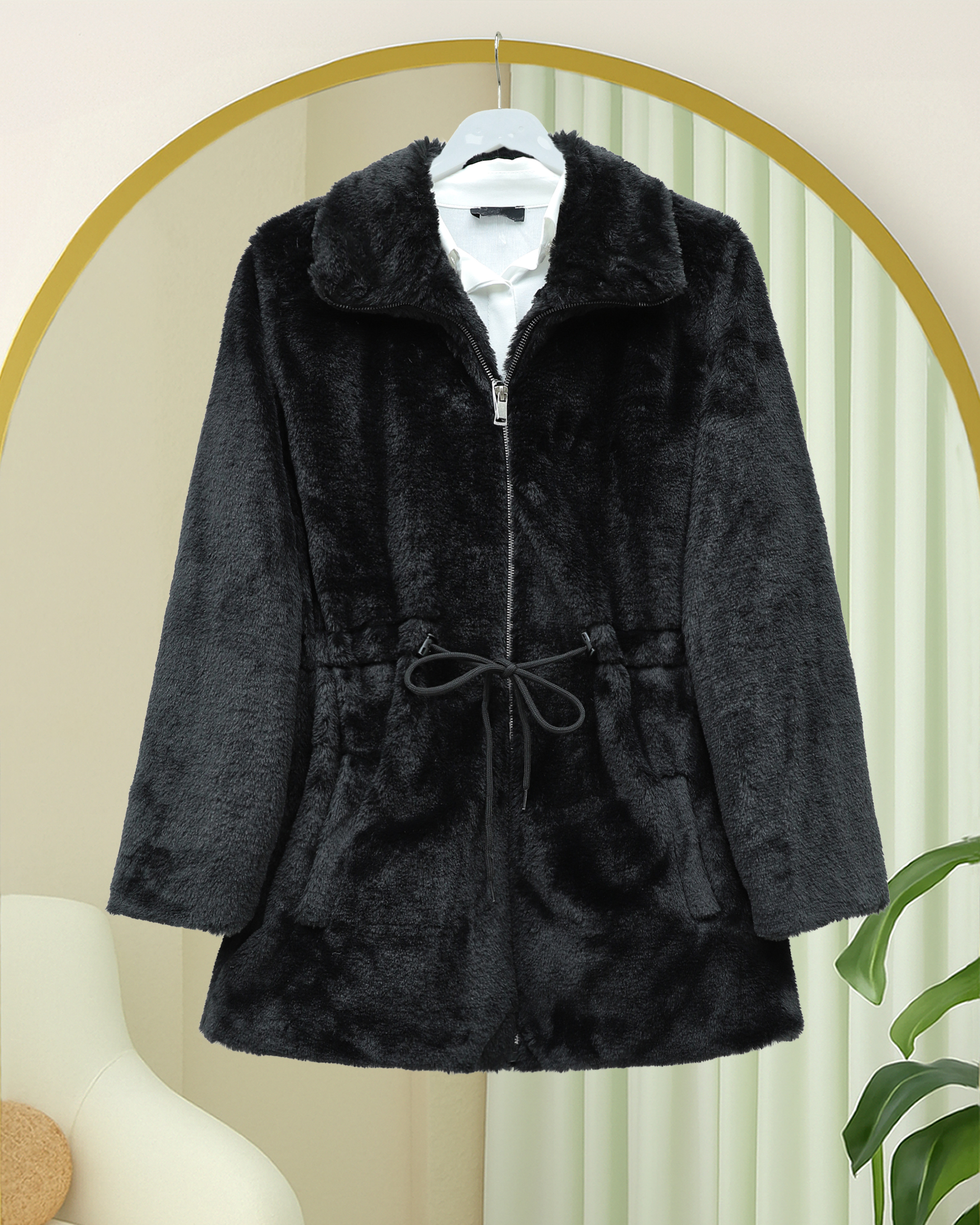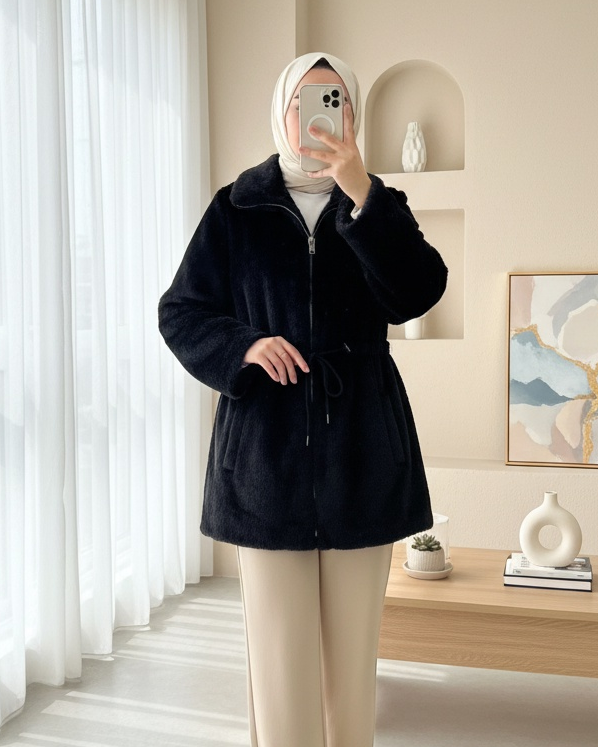Tünel Bağcıklı Cepli Astarlı Kürklü Ceket -Siyah-siyah