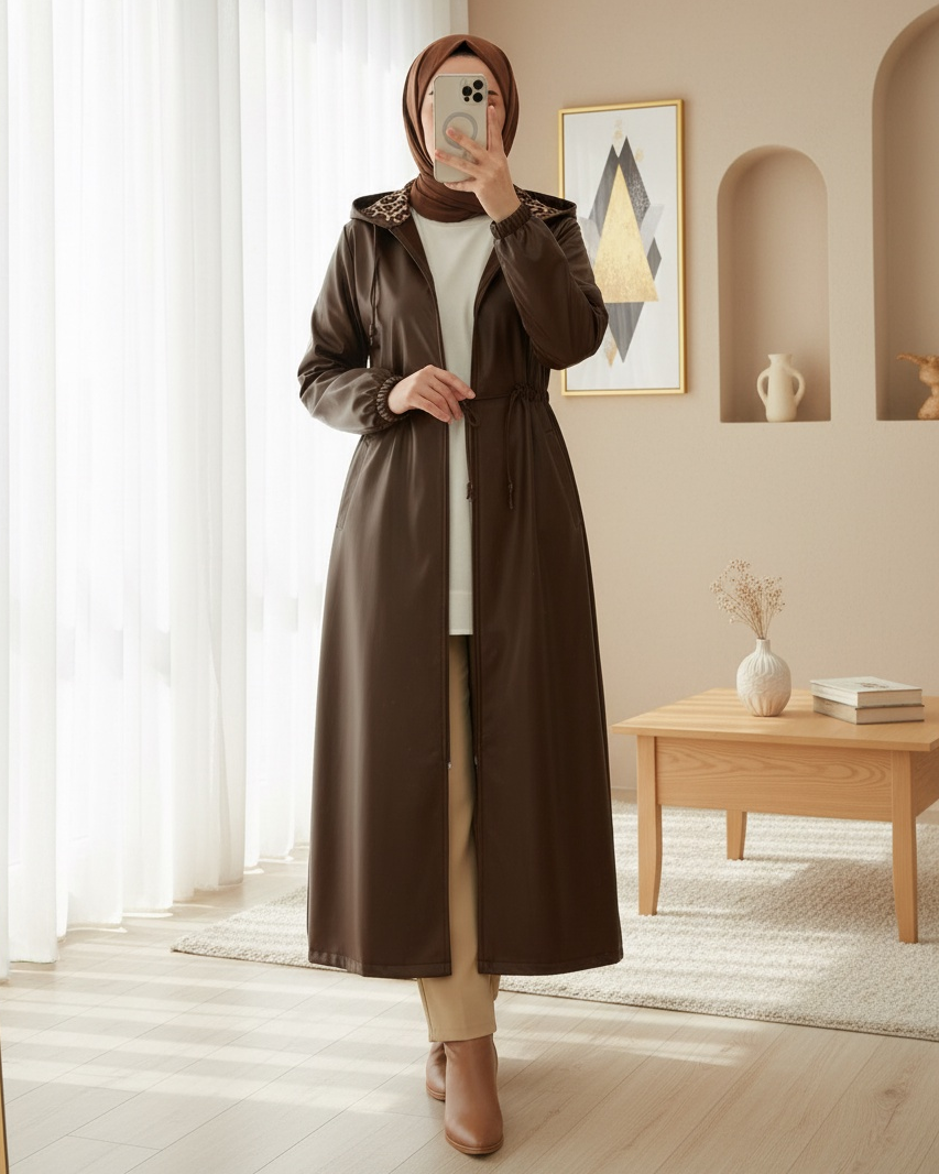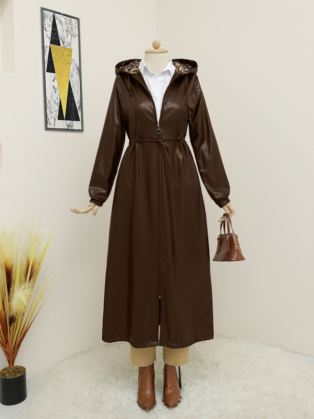 Tünel Bağcıklı Kapşonlu Uzun Deri Kap -Kahve-Kahve