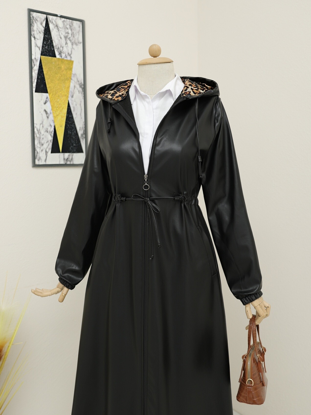 Tünel Bağcıklı Kapşonlu Uzun Deri Kap -Siyah-Siyah