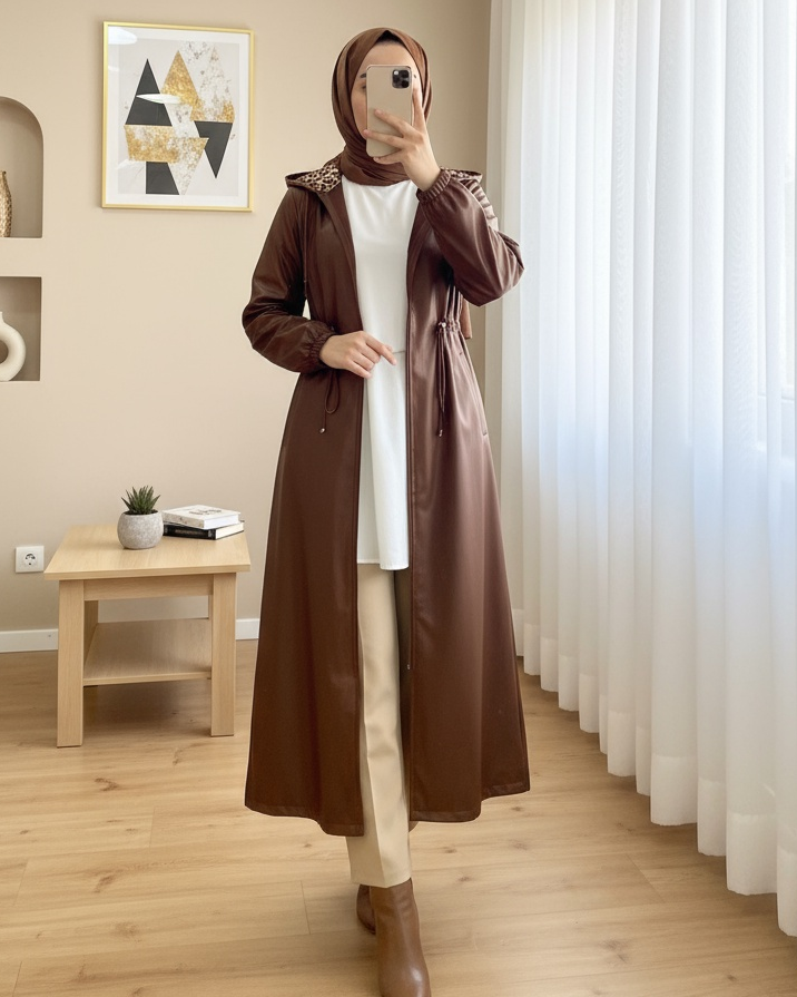 Tünel Bağcıklı Kapşonlu Uzun Deri Kap -Taba-Taba