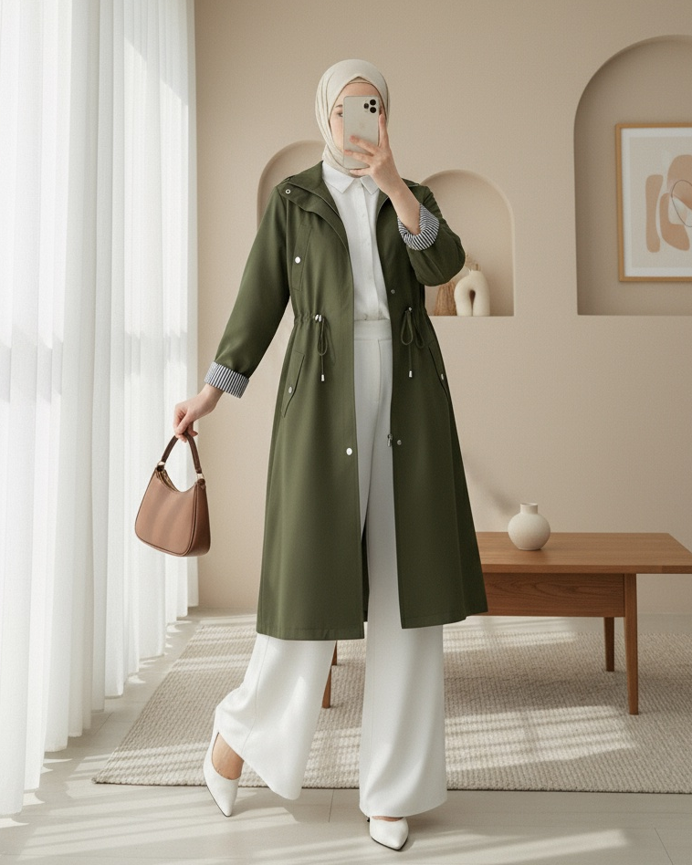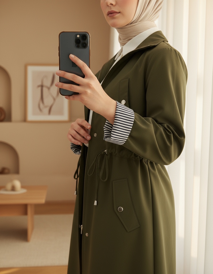 Tünel Bağcıklı Üst Cep Detaylı Astarsız Yıkamalı Organik Koton Trenckot -Haki-Haki