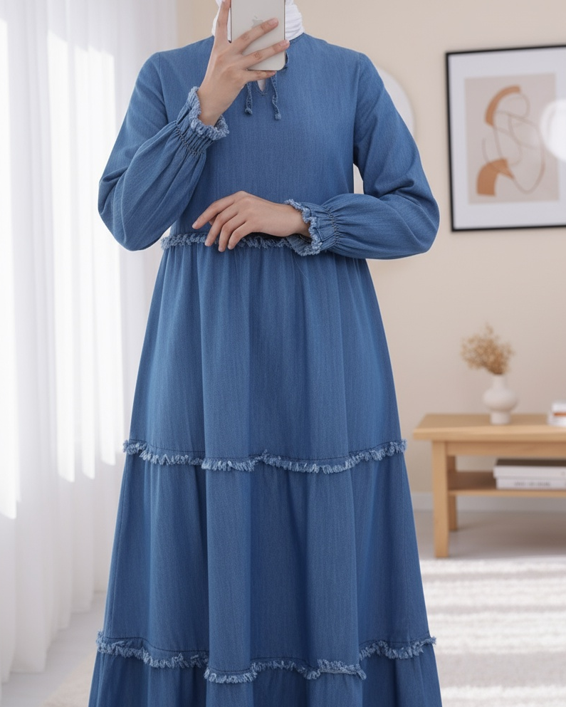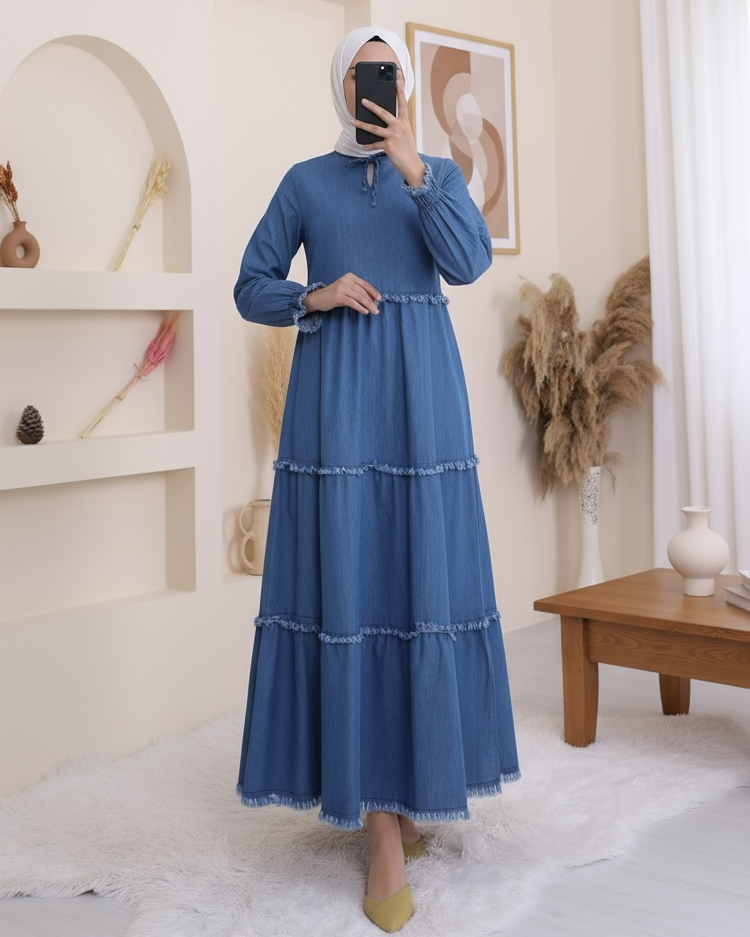 Üç Parça Yıkamalı Kot Elbise -Mavi-Mavi