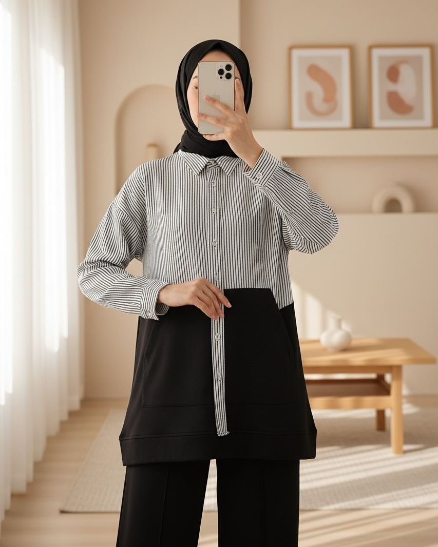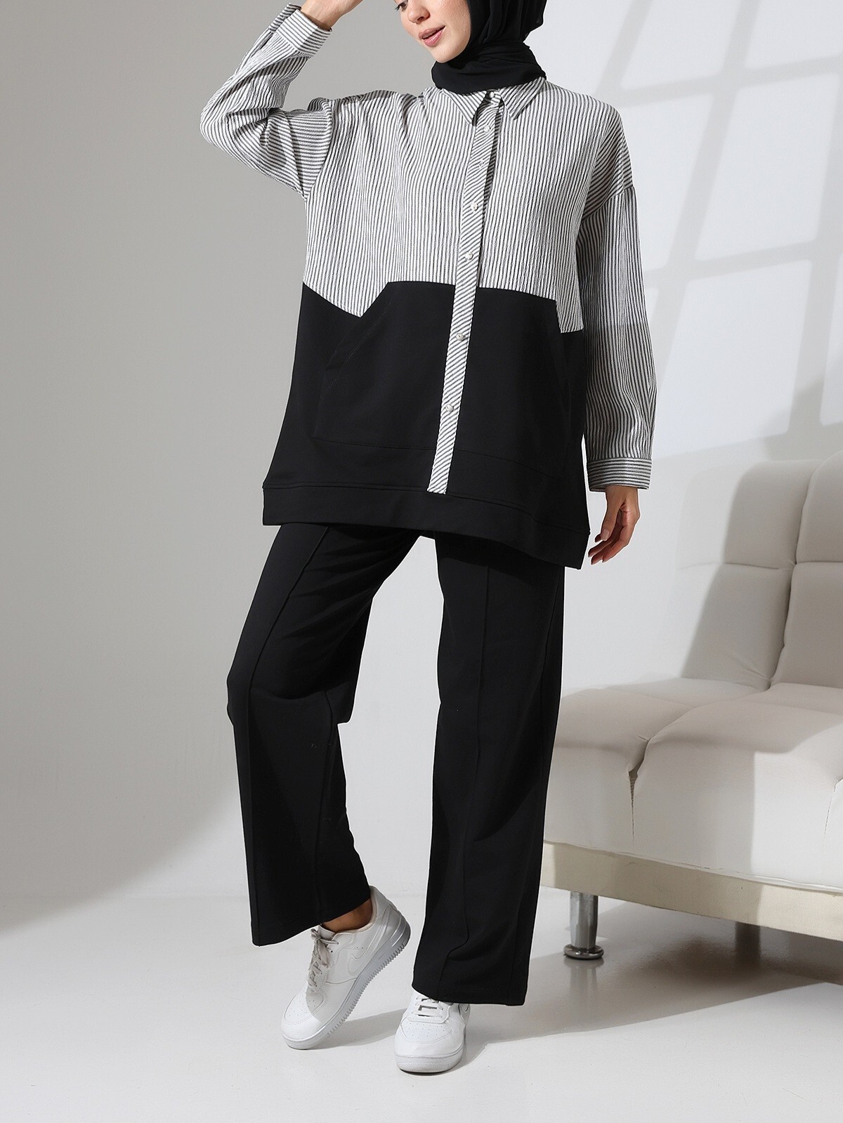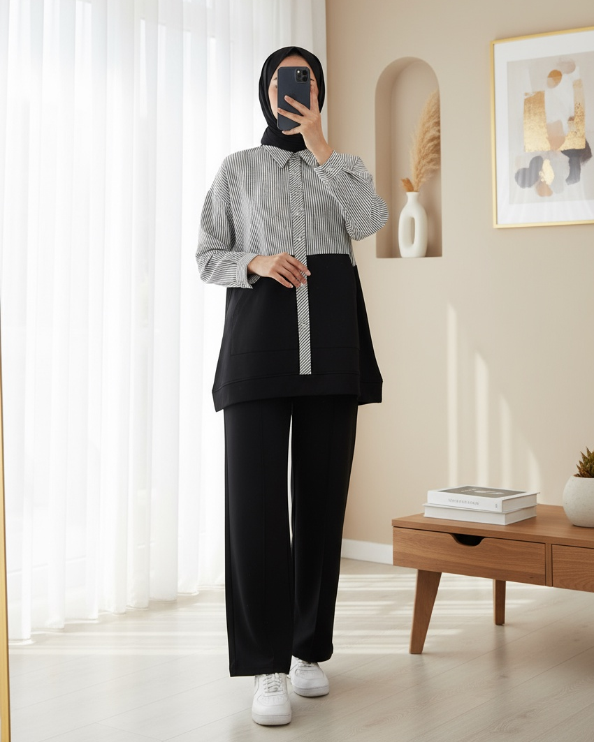 Üstü Çizgili Gömlek Detaylı Takım -Siyah-Siyah