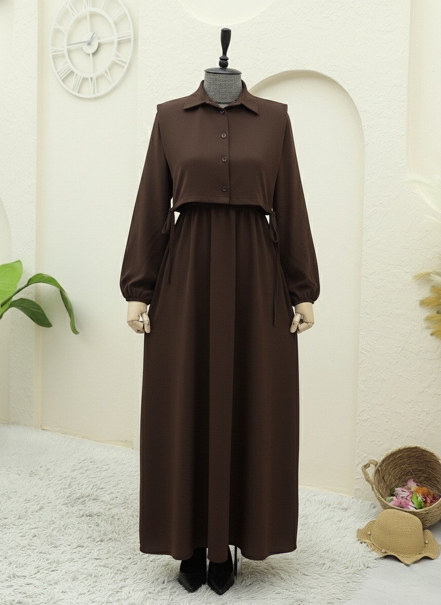 Üstü Gömlek Detaylı Elbise Takım -Kahve-Kahve