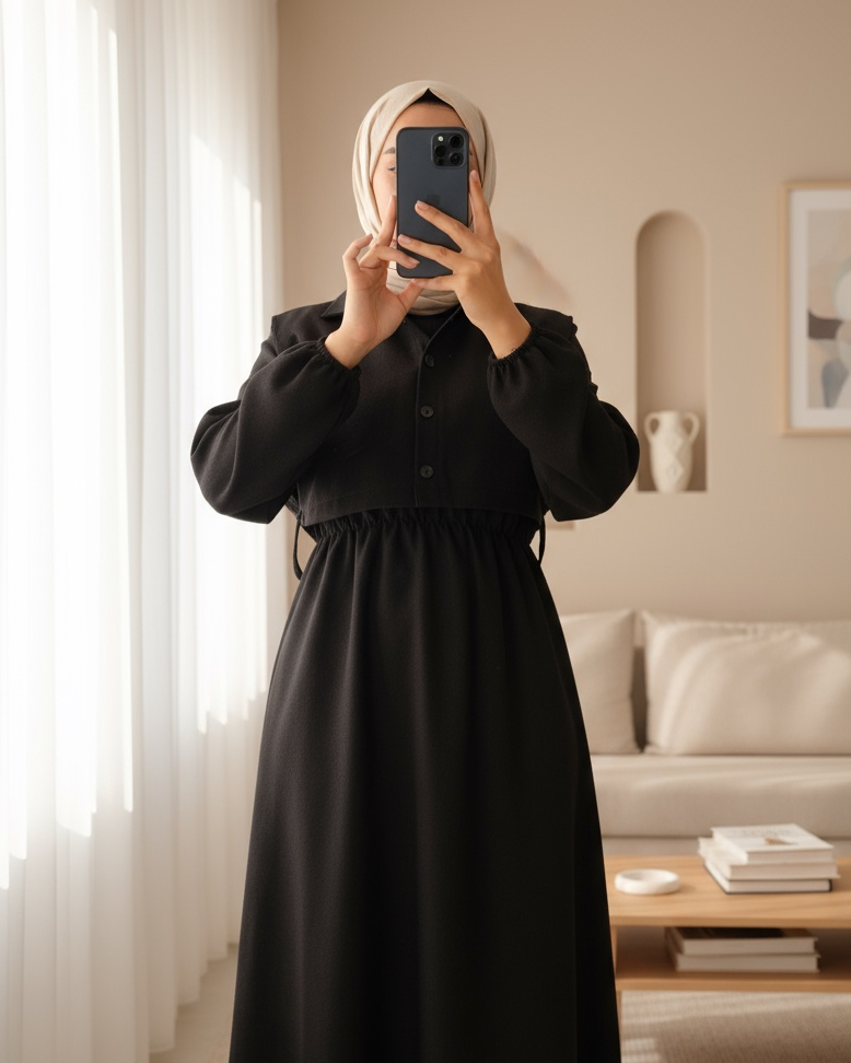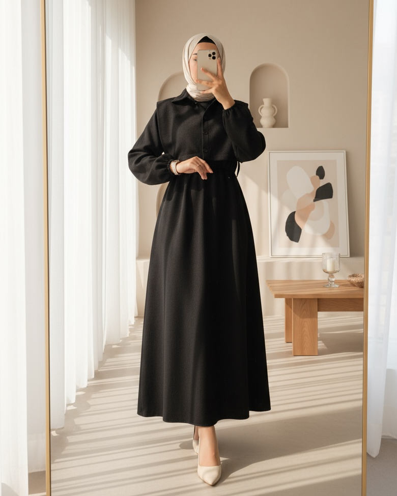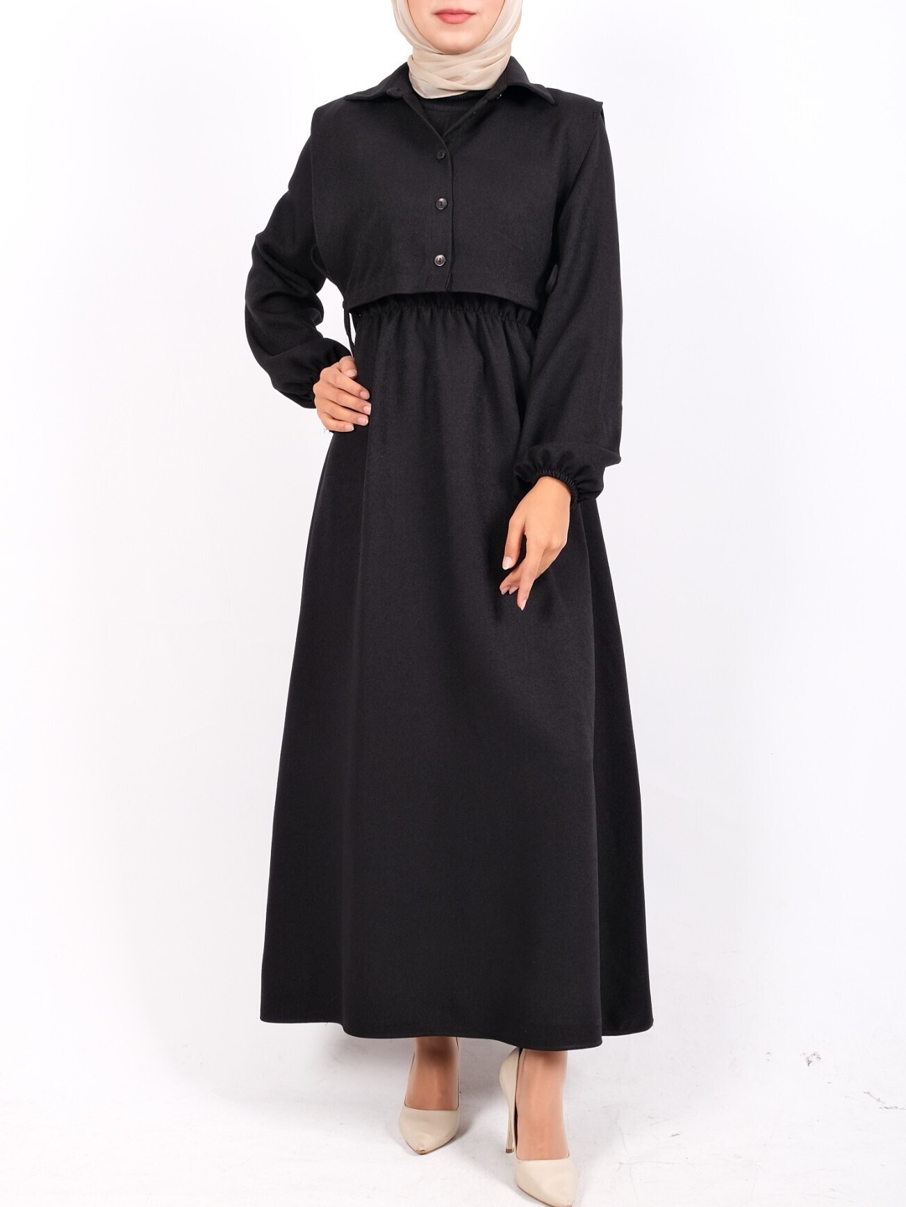 Üstü Gömlek Detaylı Kolu Ve Beli Lastikli Elbise -Siyah-Siyah
