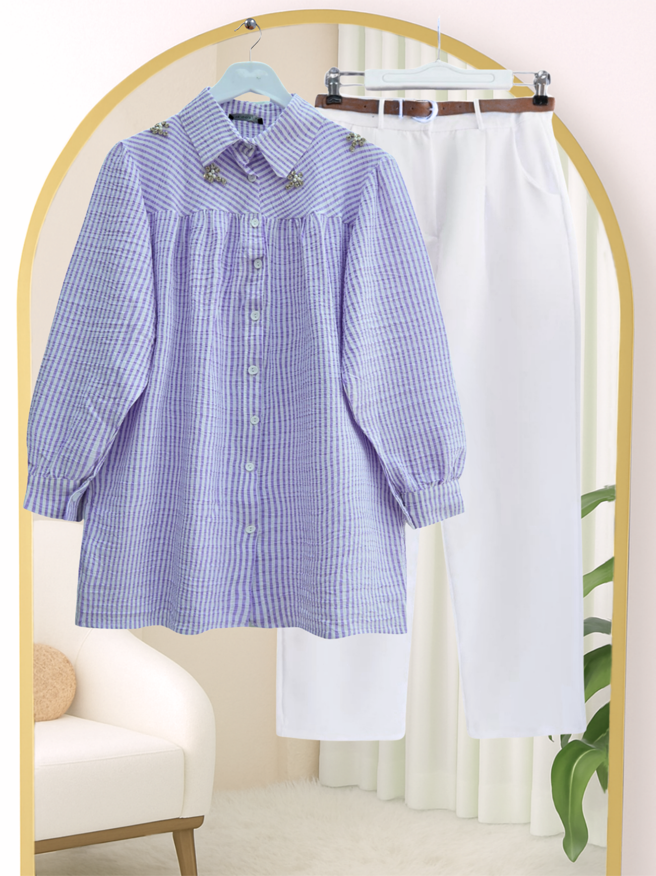 Üstü Taş Ve Boncuk Detaylı Çizgili Gömlek -Lila-Lila