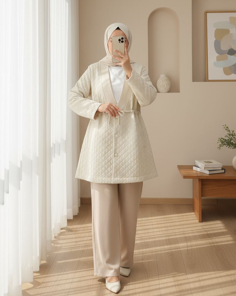 V Yaka Beli Bağcıklı Cepli Düğmeli Kap -Bej-Bej