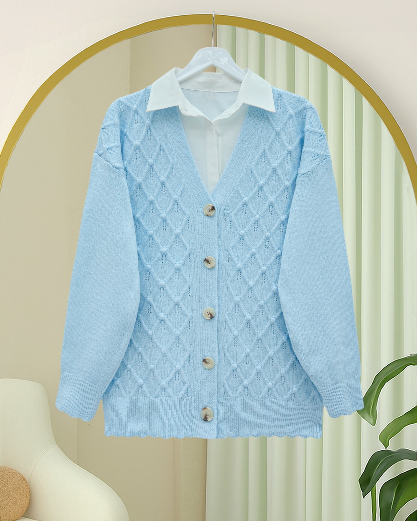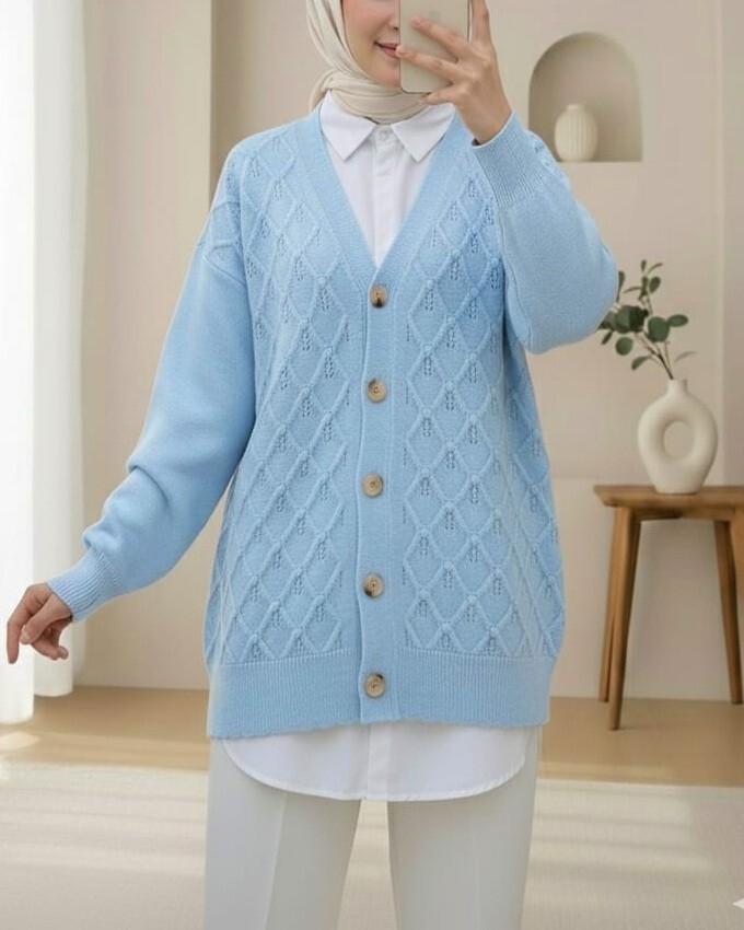 V Yaka Büyük Düğmeli Desenli Triko Hırka -Bebe Mavi-Bebe Mavi
