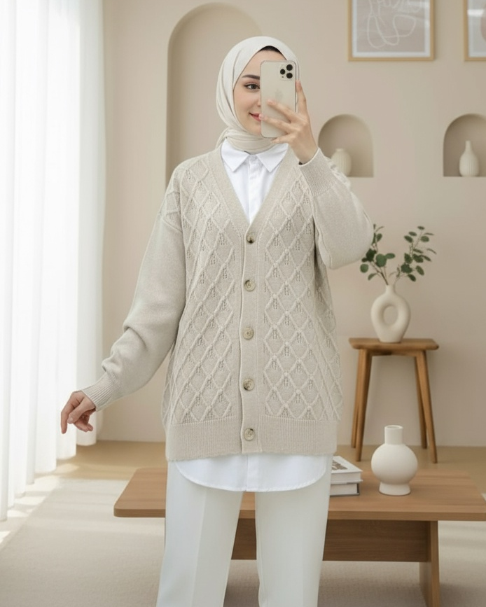 V Yaka Büyük Düğmeli Desenli Triko Hırka -Taş-Taş