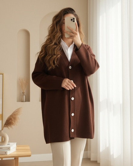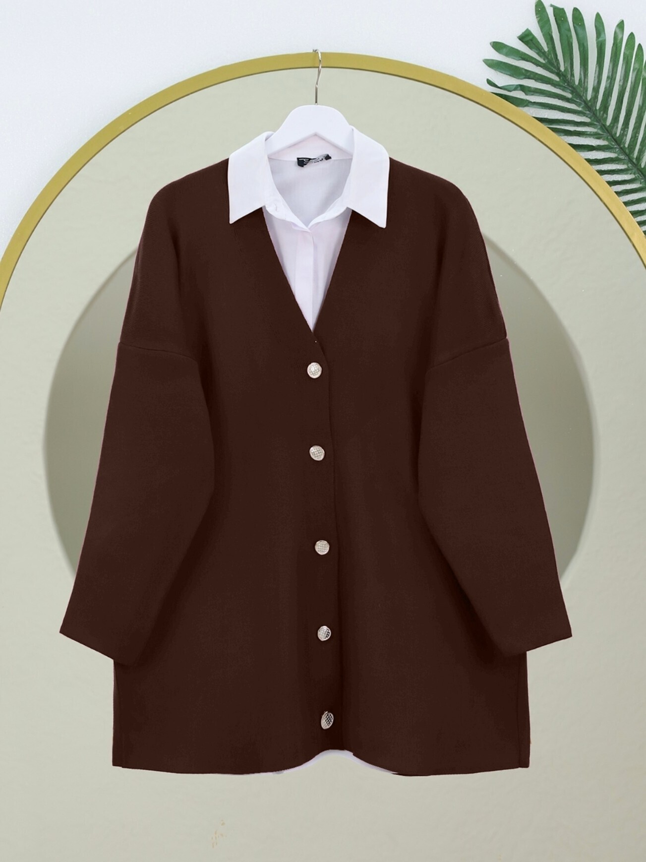 V Yaka Düğmeli Oversize Triko Hırka -Kahve-Kahve