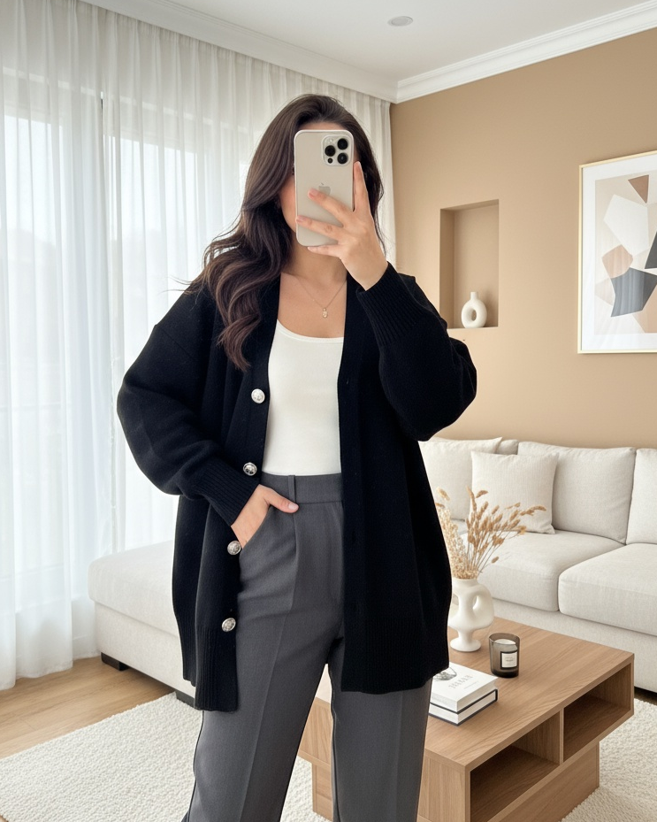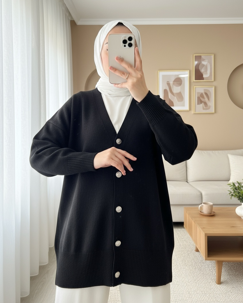 V Yaka Düğmeli Triko Hırka -Siyah-siyah