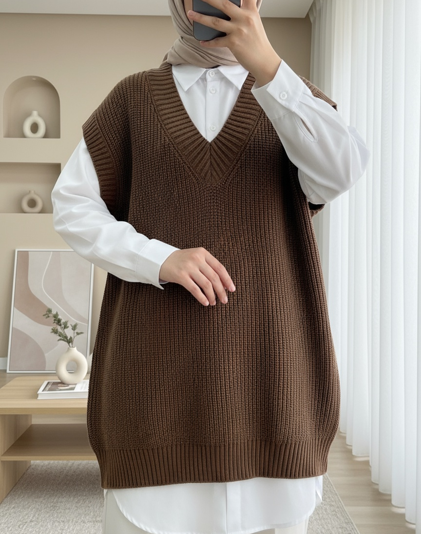 V yaka Geniz Ribanalı Prinç Örme Uzun Süveter -K. Kahve-K. Kahve