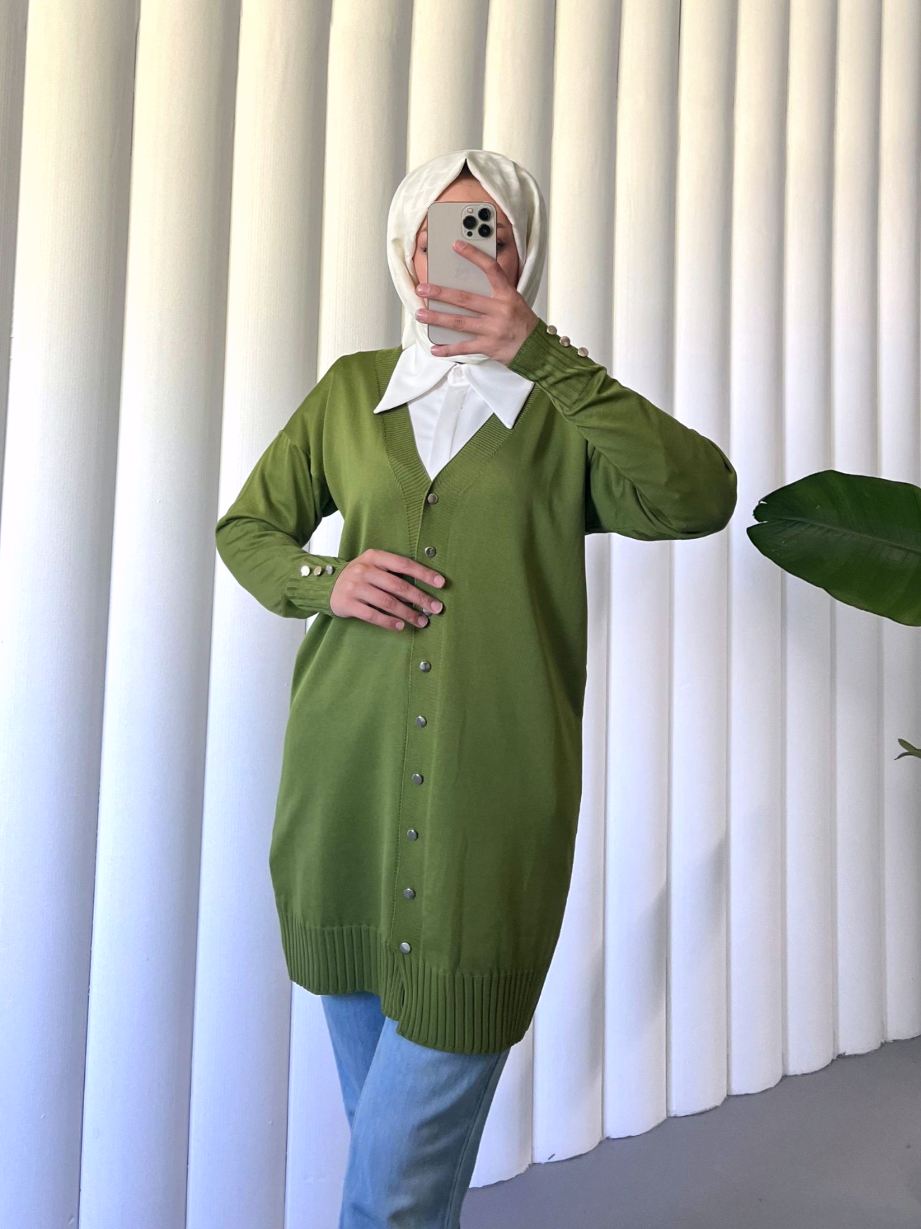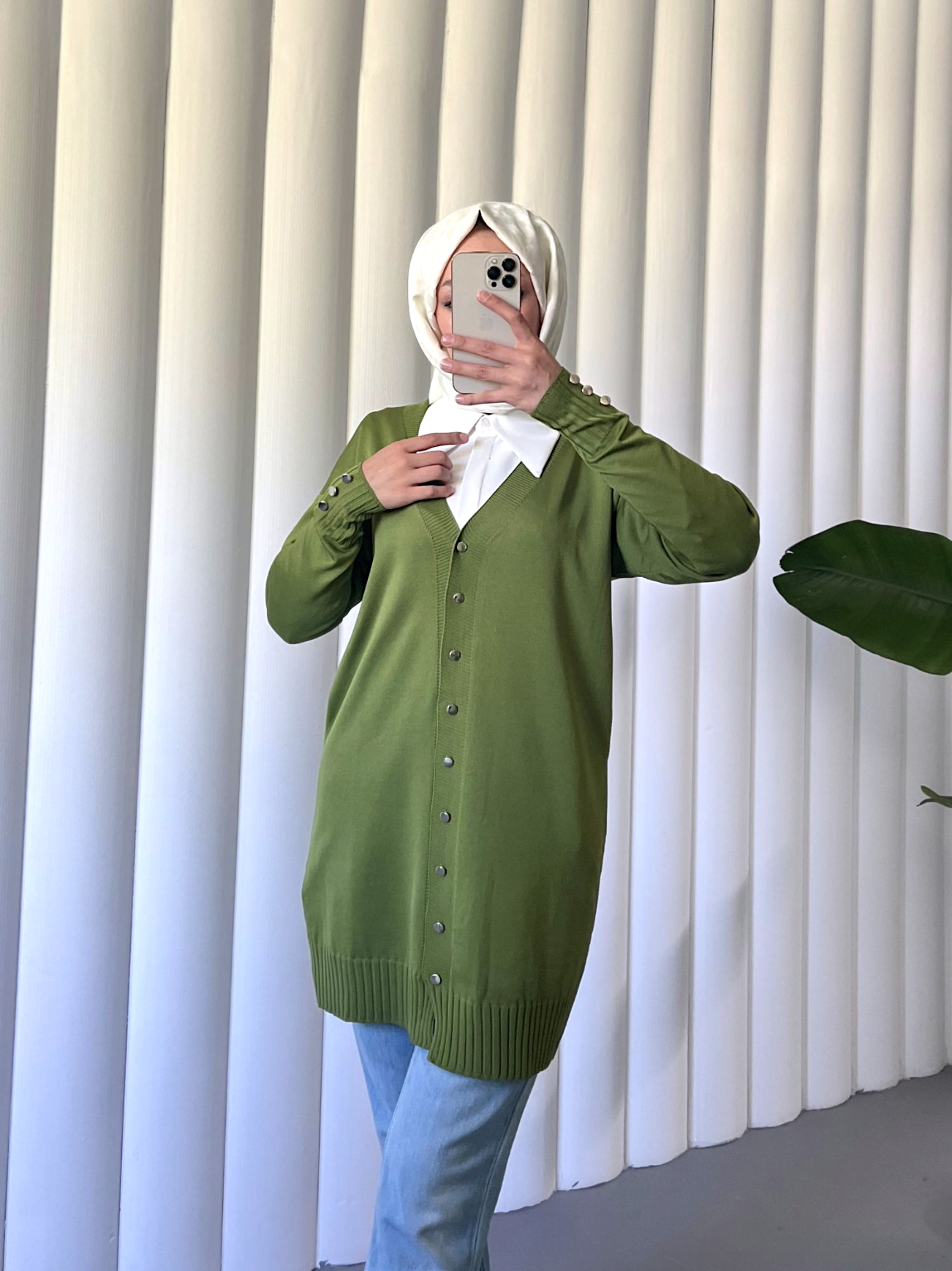 V Yaka Önü Düğmeli Triko Hırka -Yeşil-Yeşil
