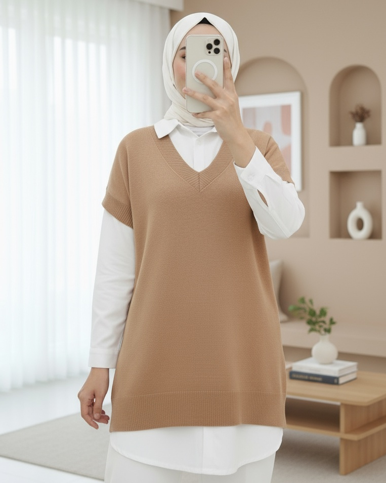 V Yaka Oversize Triko Süveter -Vizon-Vizon