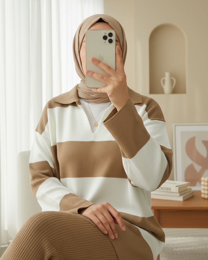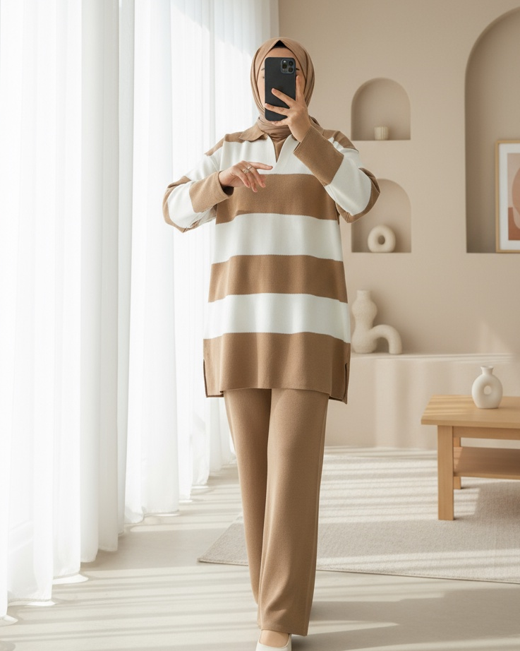 V Yaka Pantolonlu Triko Takım -Taba-Taba