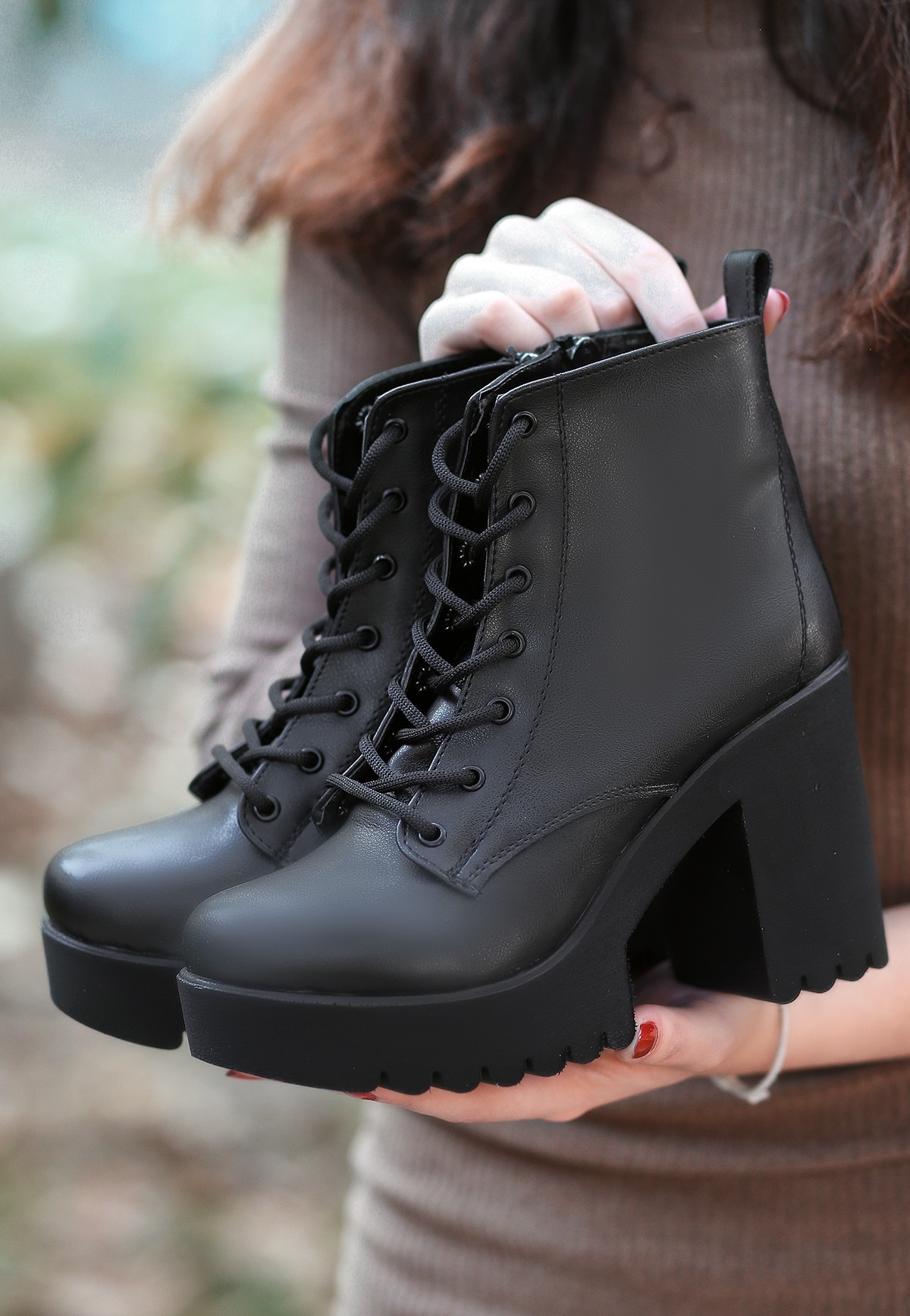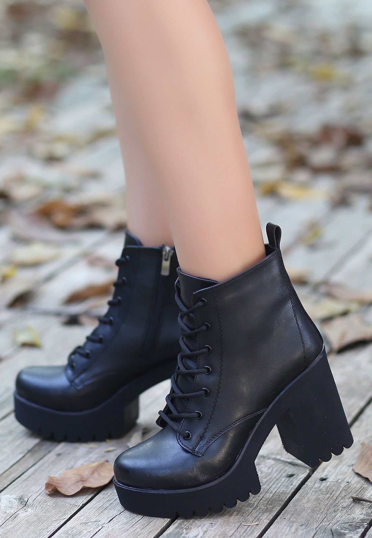 Salto Siyah Cilt Bağcıklı Topuklu Bot-Siyah