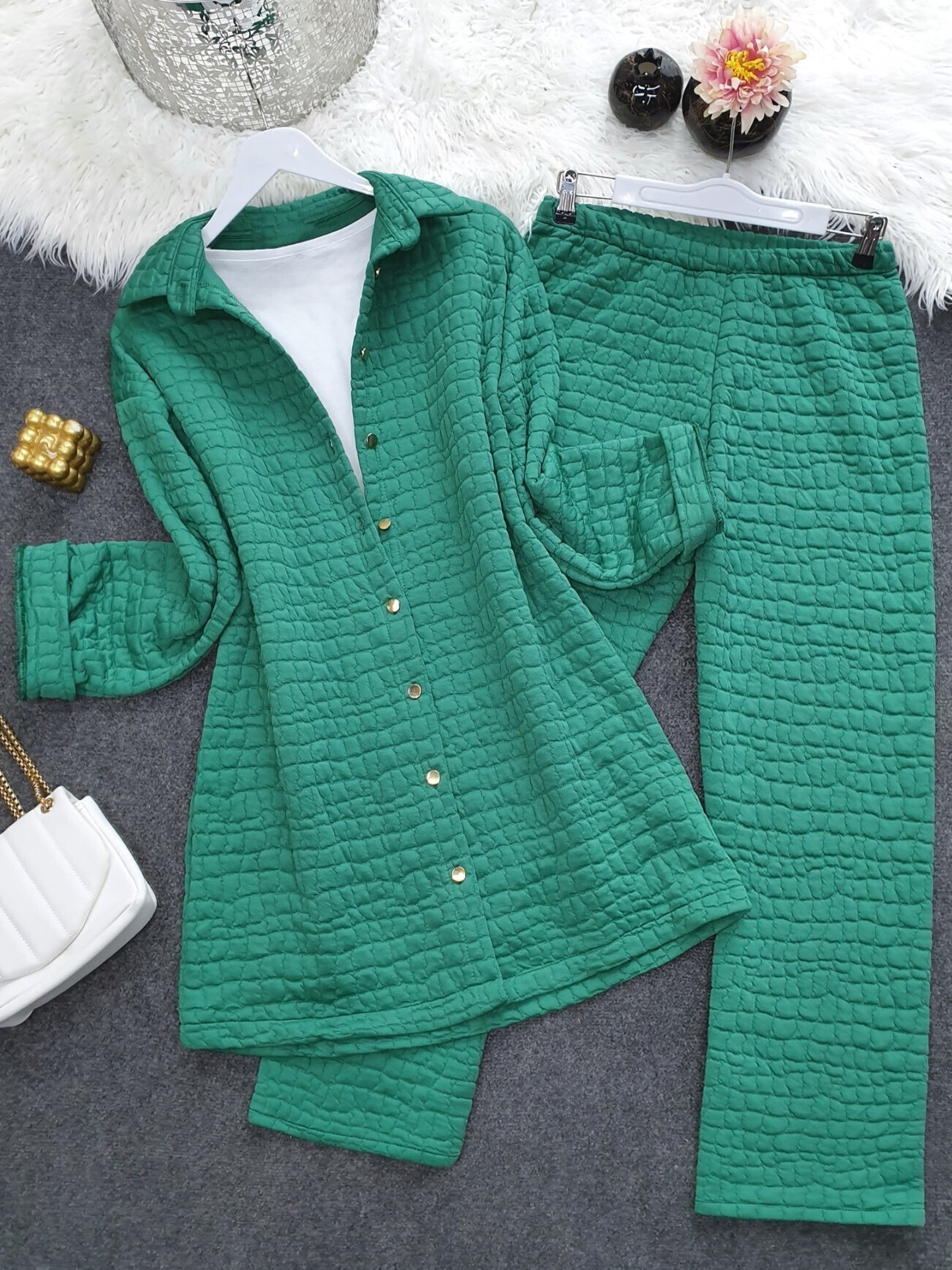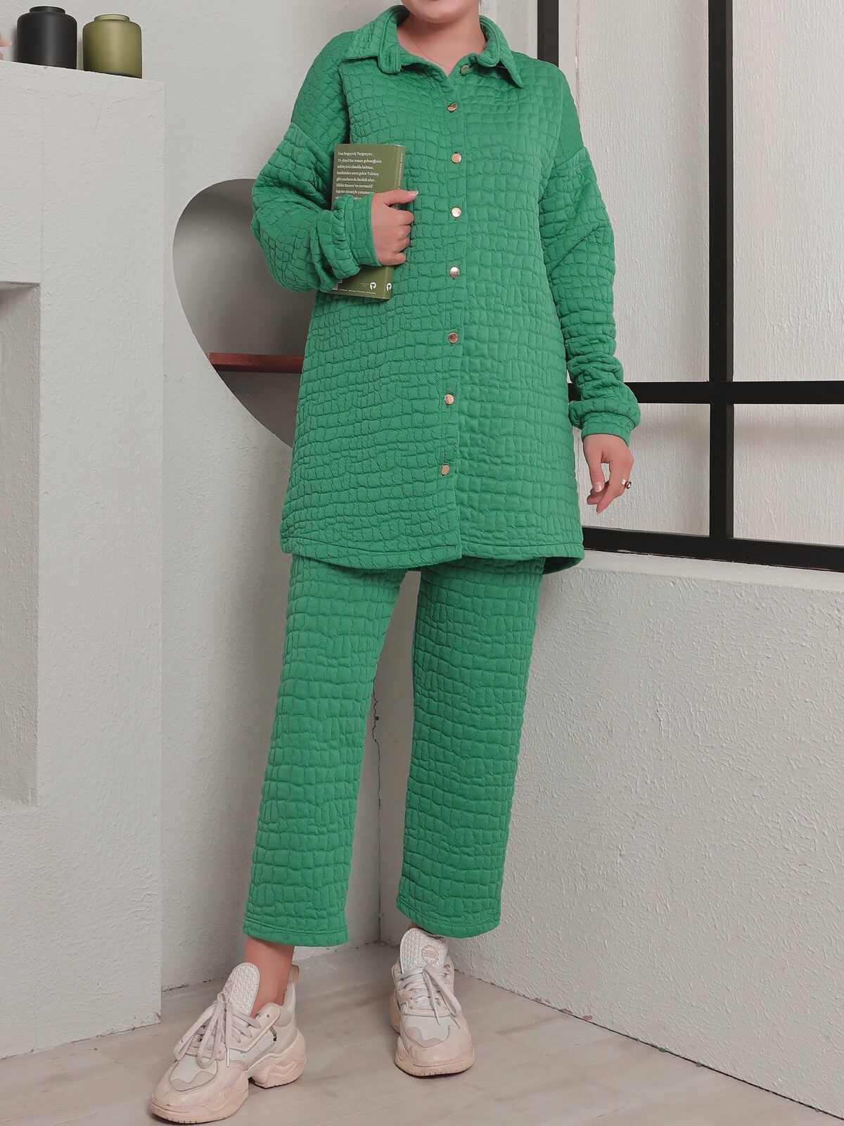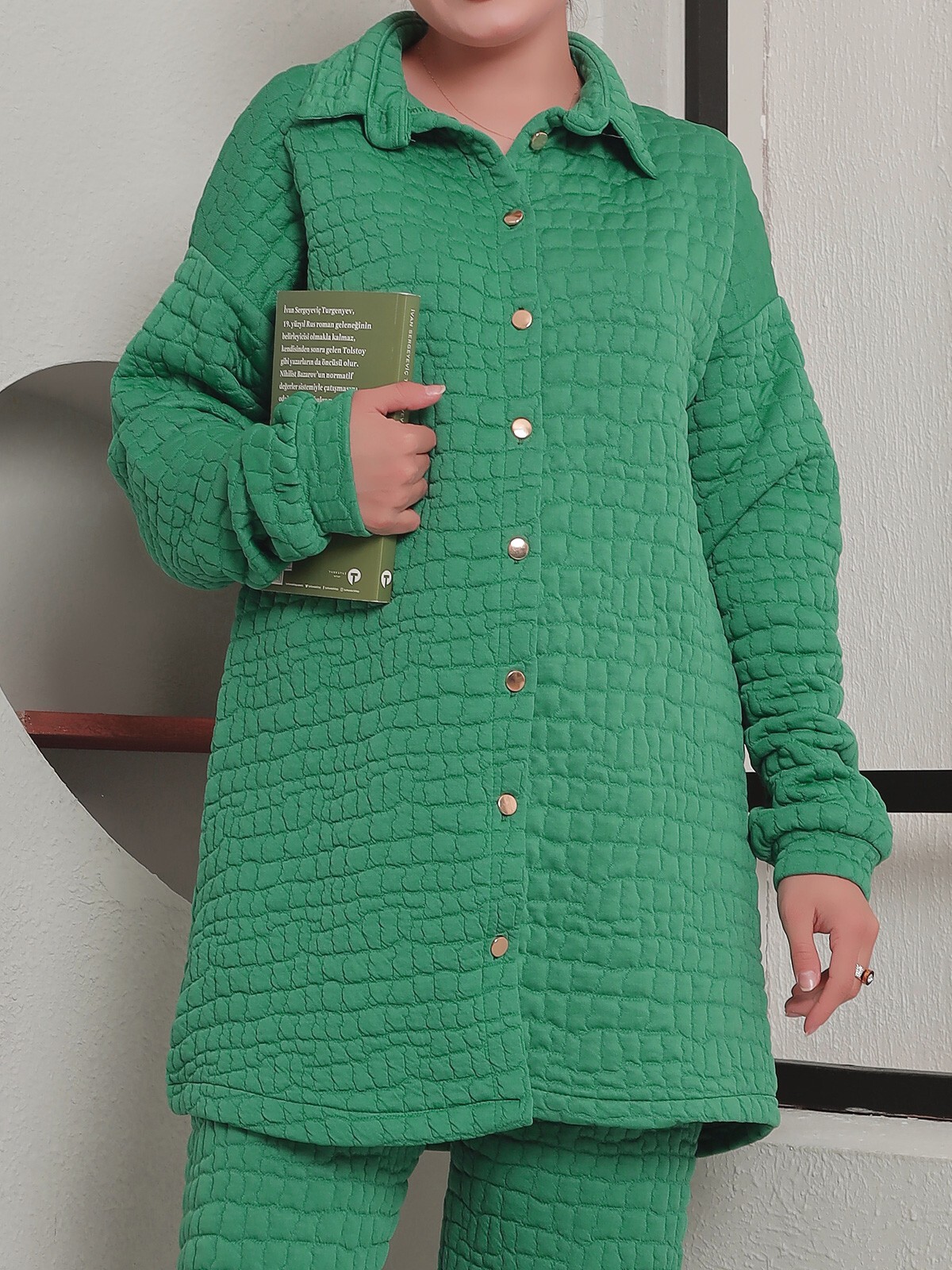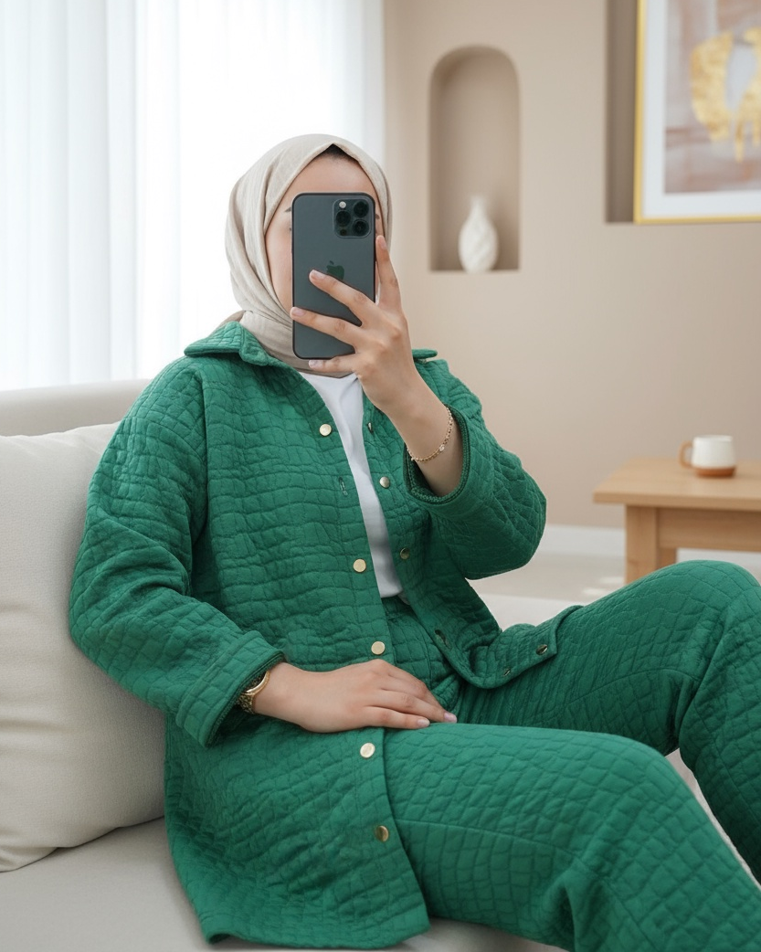 Yakalı Boydan Düğmeli Kapitone Takım -Yeşil-Yeşil