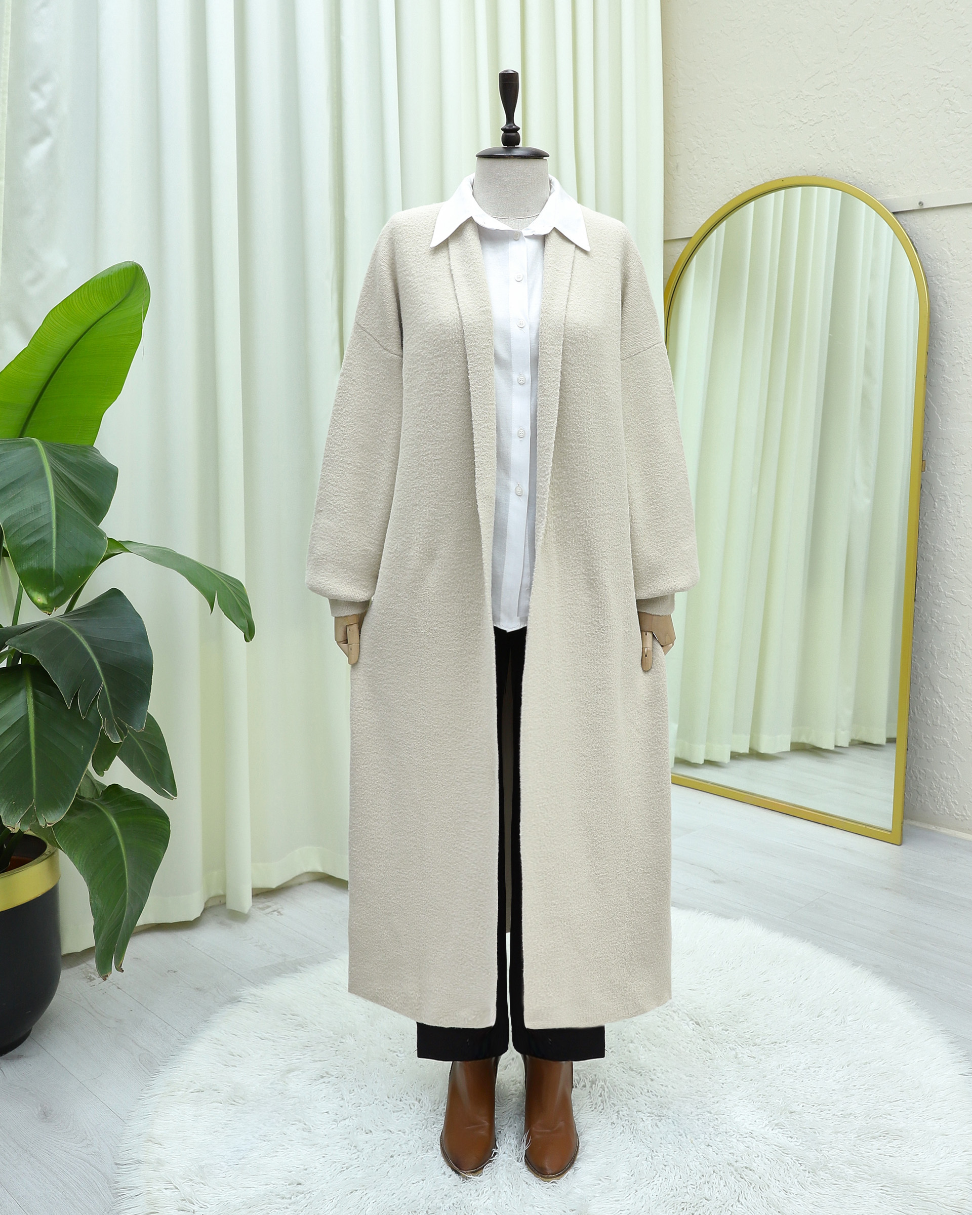 Yakalı Uzun Salaş Yumoş Hırka -Ekru-Ekru