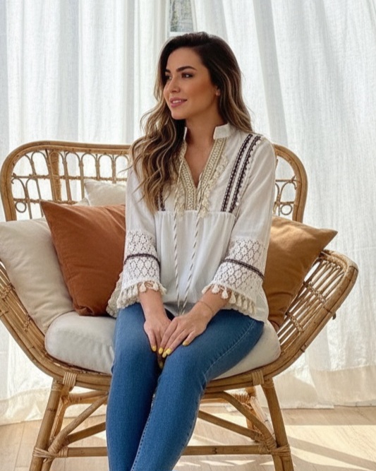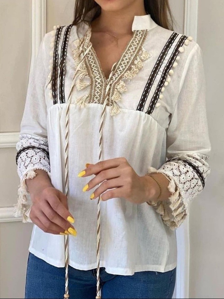 Yakası Bağcıklı Kolu Dantelli Püsküllü Bluz -Beyaz-Beyaz