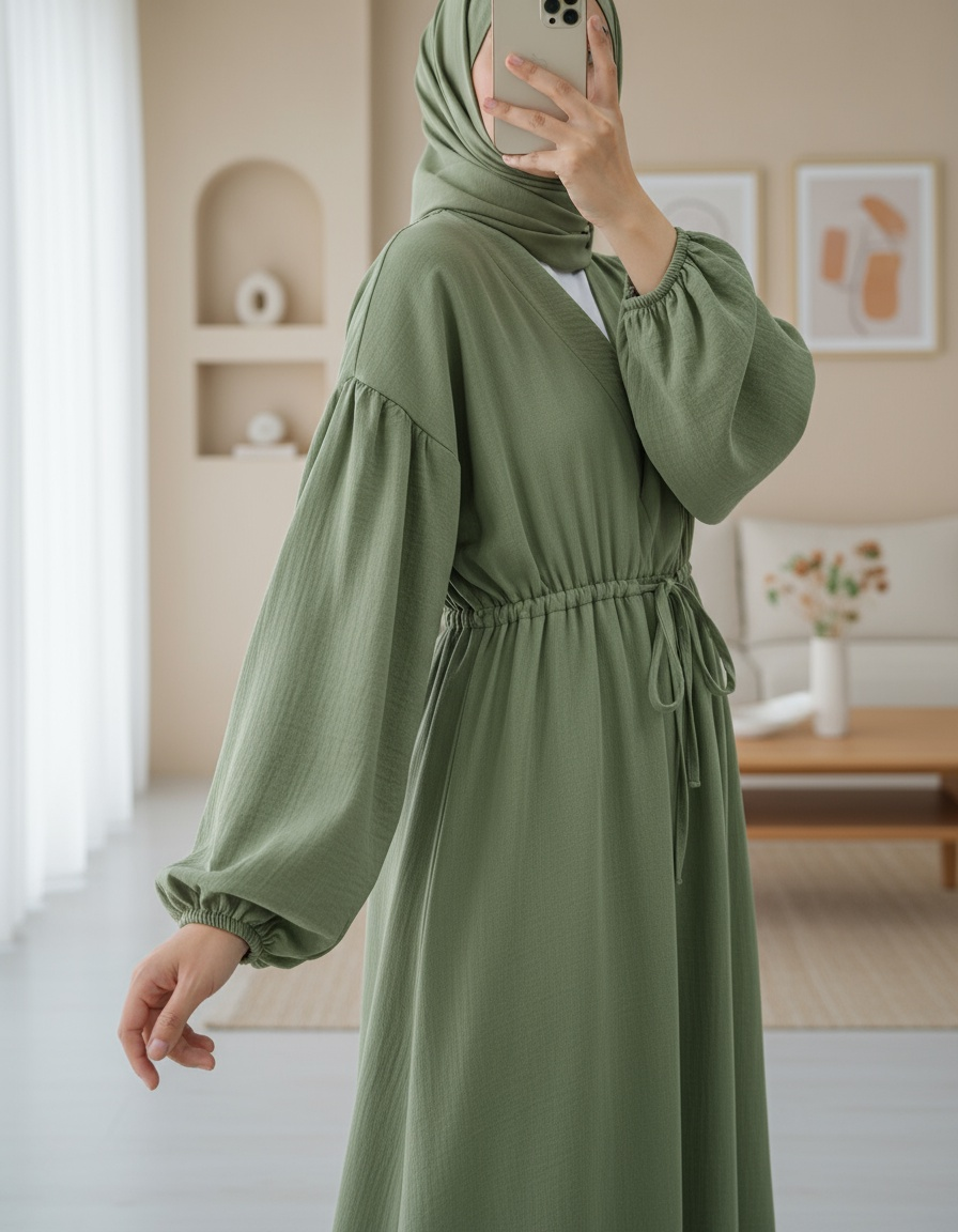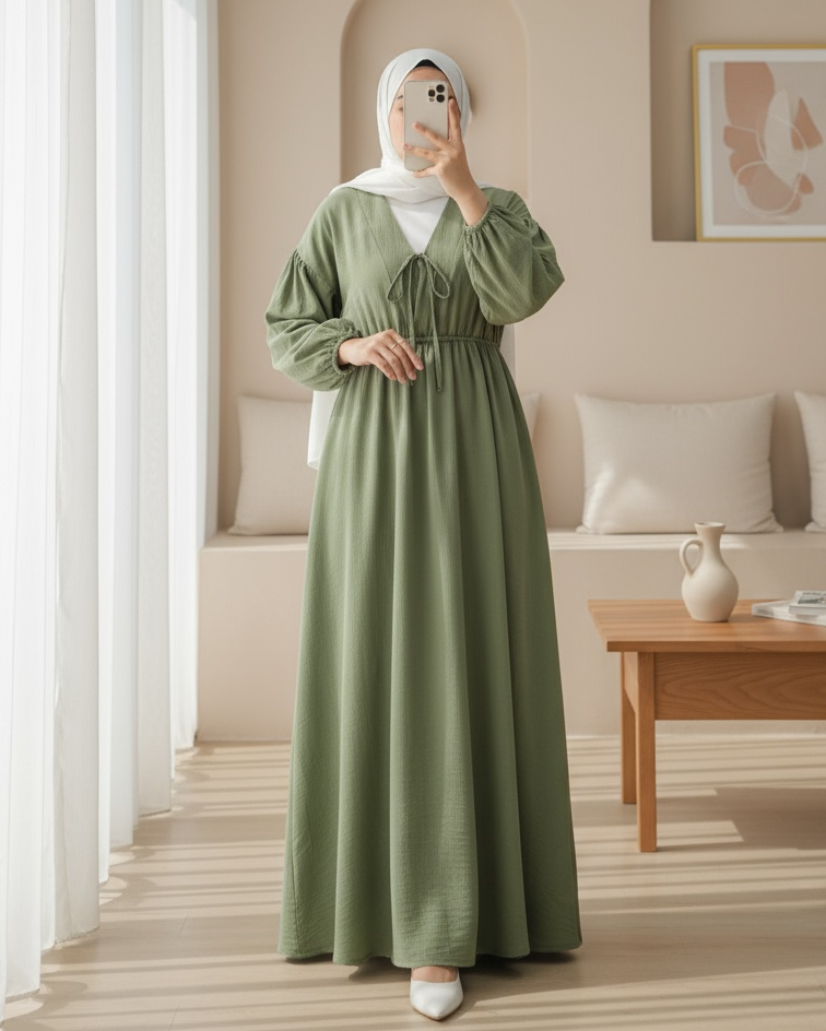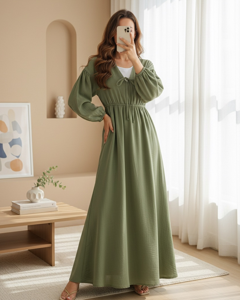 Yakası Bağlamalı Kolu Ve Beli Lastikli Müslin Elbise -Yeşil-Yeşil