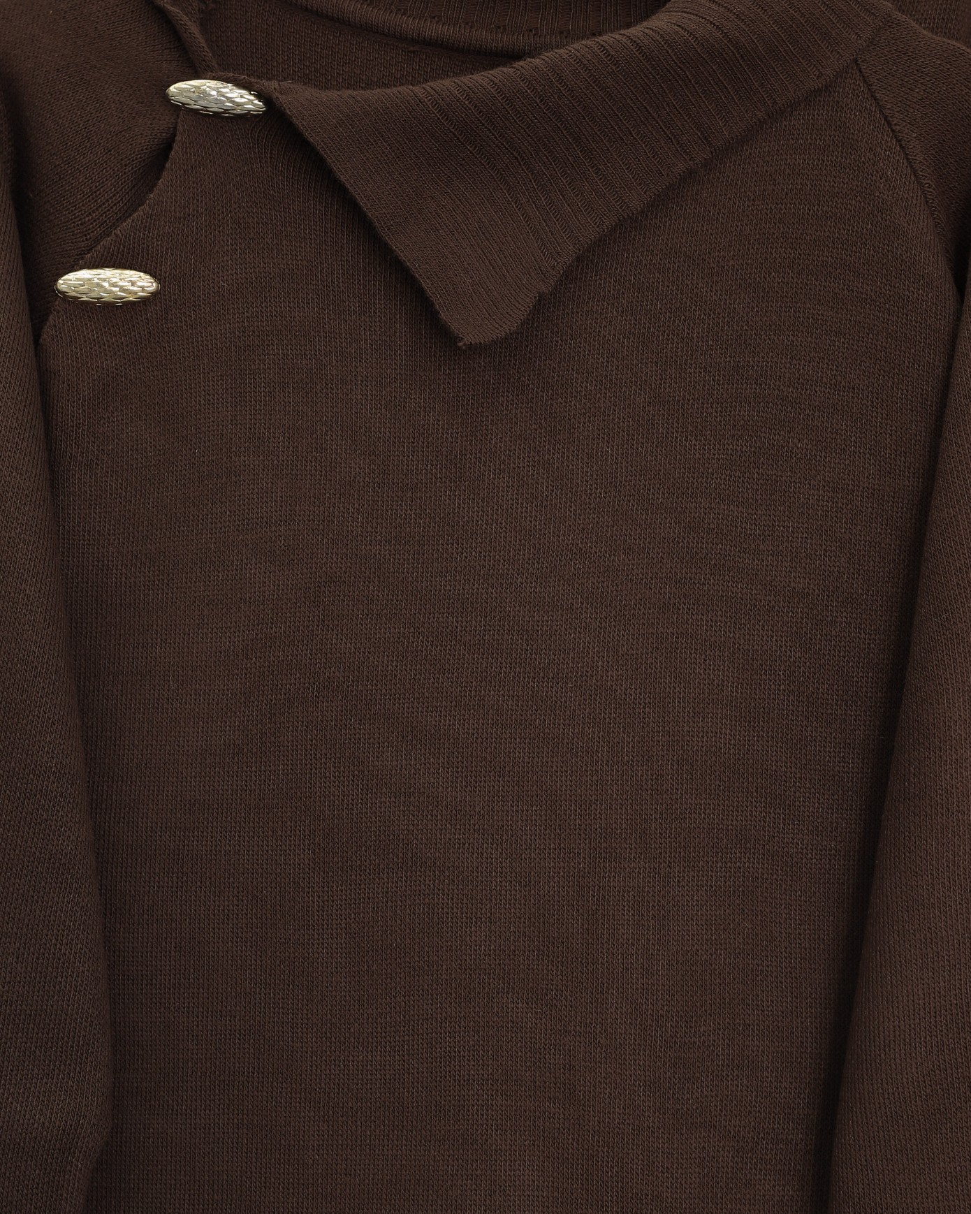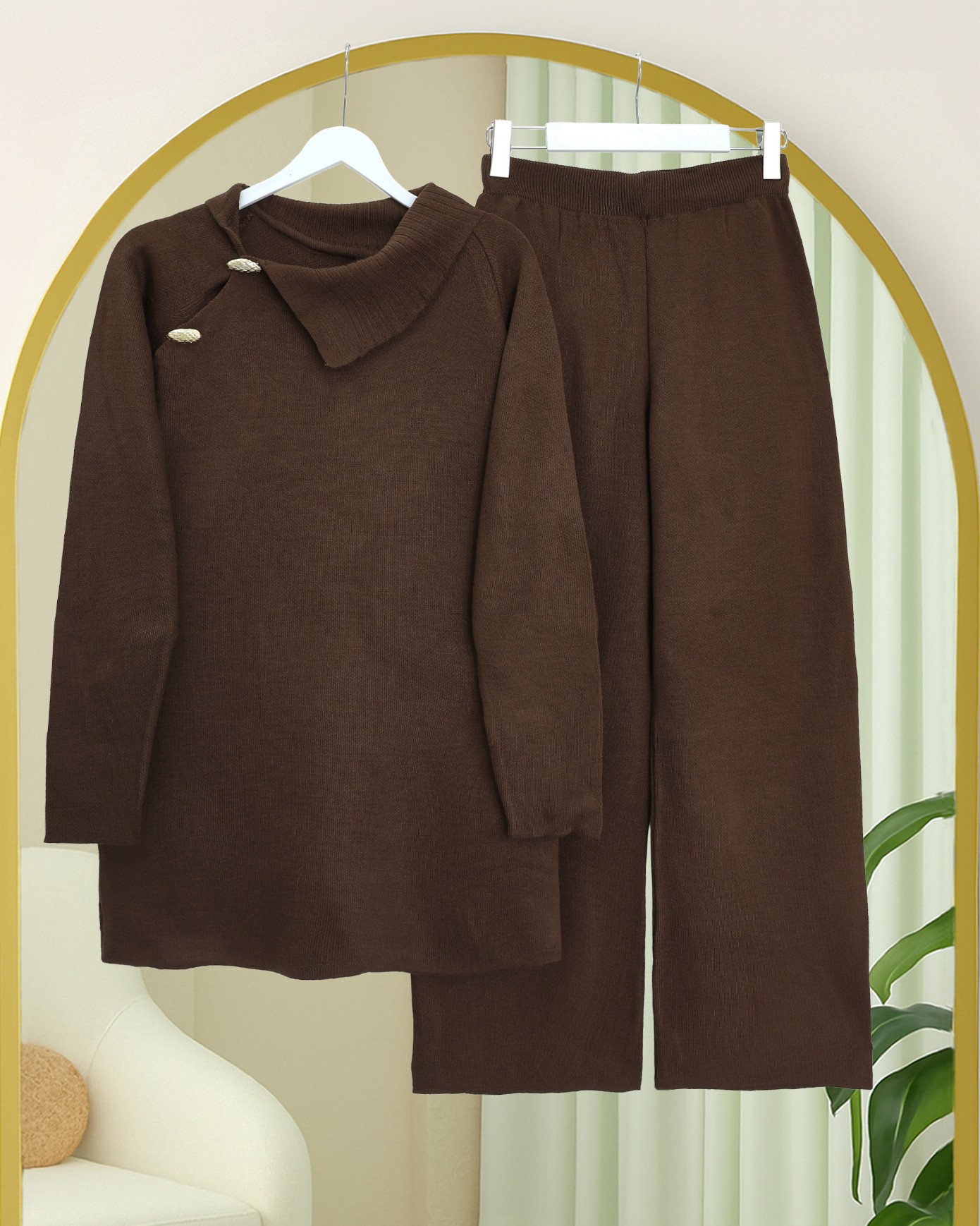 Yakası Çapraz Düğmeli Yarım Boğazlı Triko Takım -Kahve-Kahve