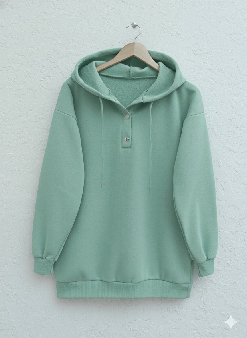 Yakası Çıtçıtlı Kapşonlu Şardonlu Üç İplik Sweat -Su Yeşili-Su Yeşili