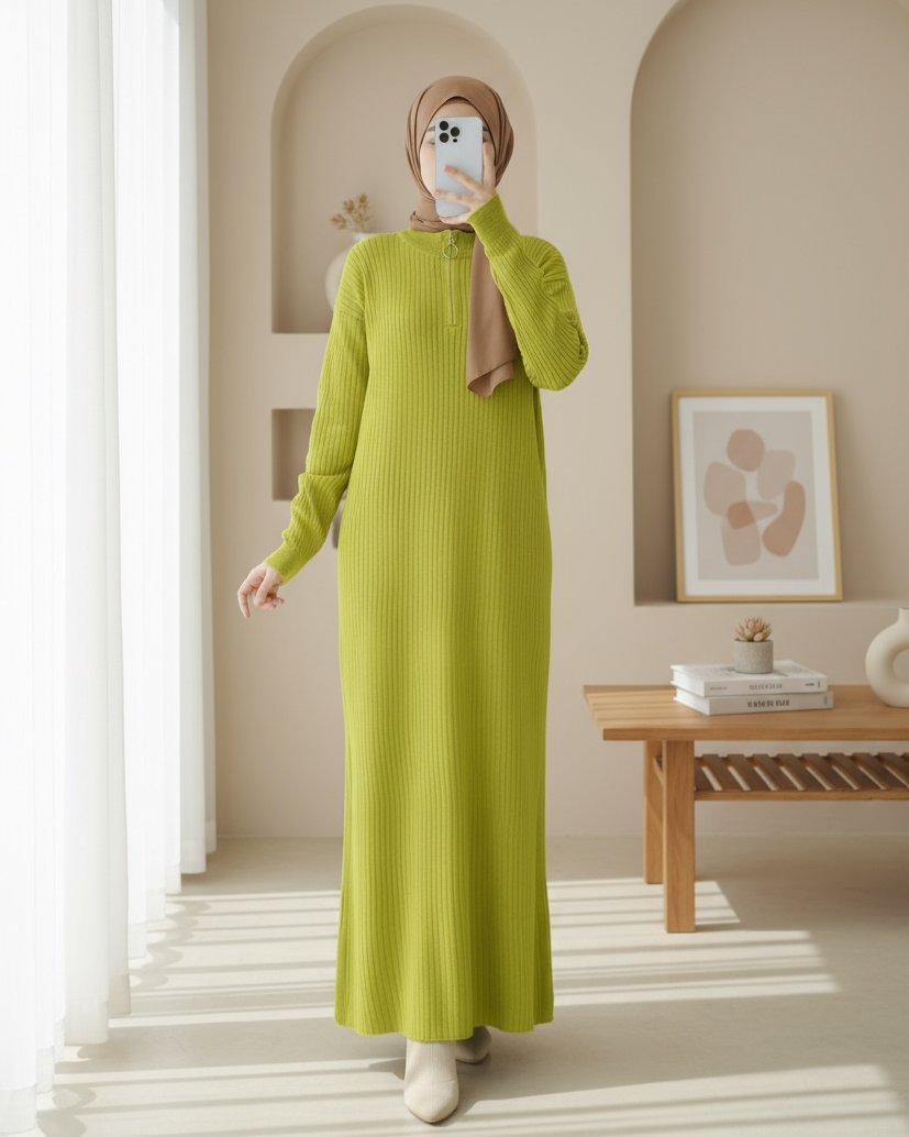 Yakası Fermuarlı Fitilli Uzun Triko Elbise -F.Yeşili-F.Yeşili