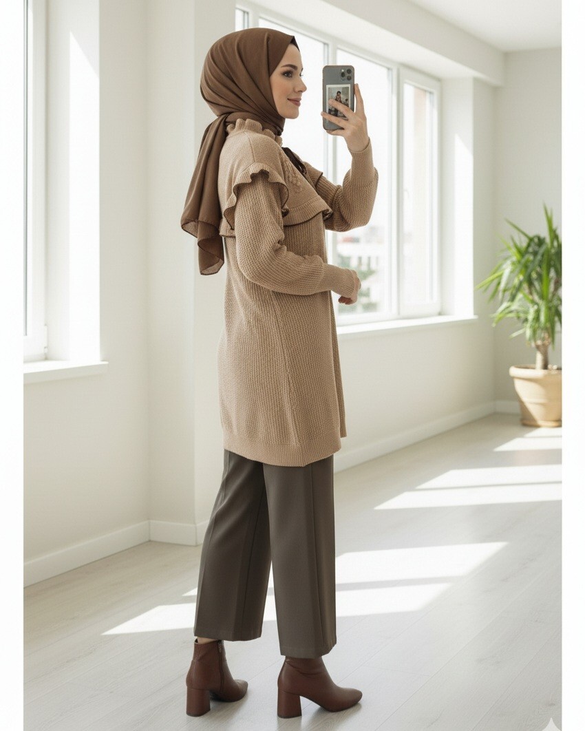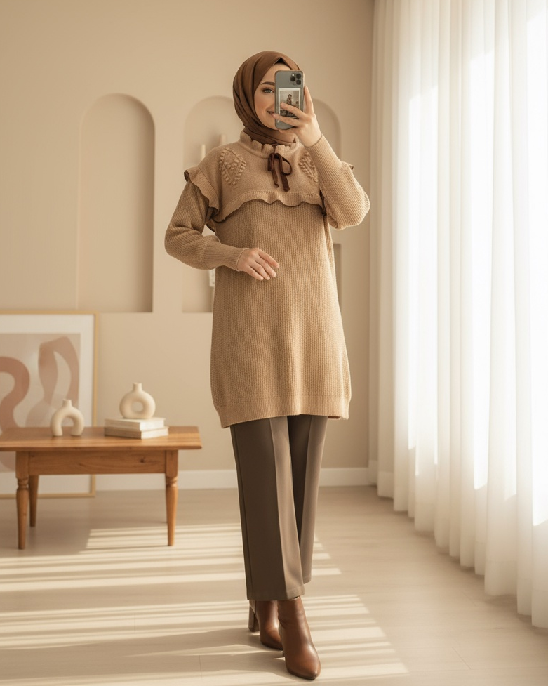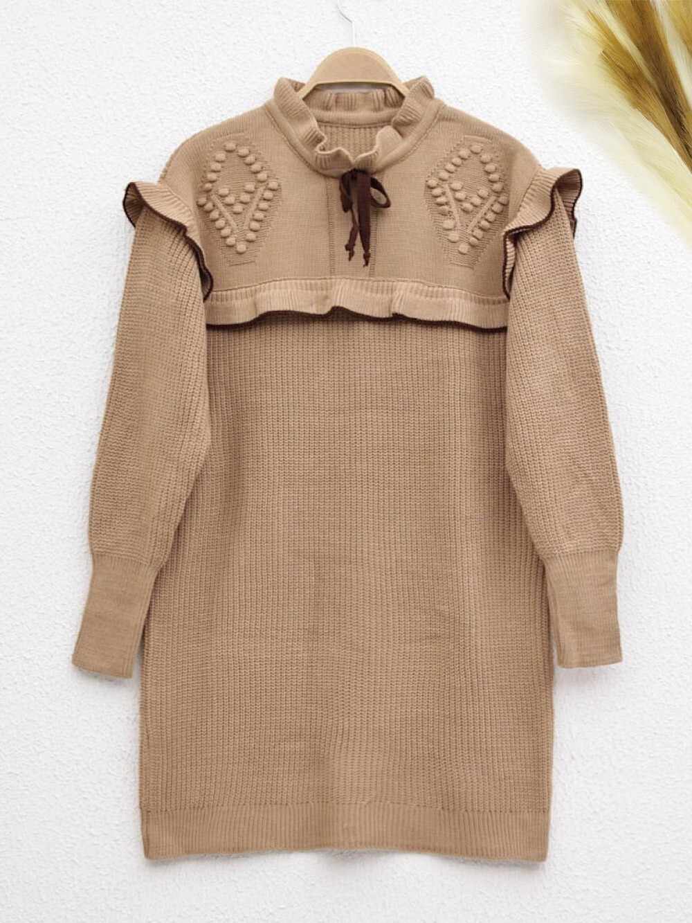 Yakası Fırfırlı Bağcıklı Triko Tunik -Vizon-Vizon