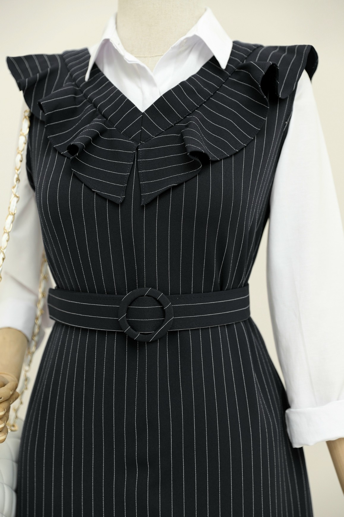 Yakası Fırfırlı Çizgili Kemerli Jile Elbise -Siyah-siyah
