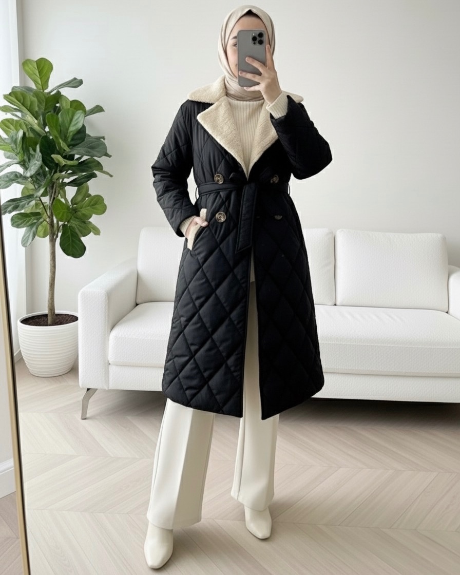 Yakası Kürklü Beli Kemerli Düğmeli Astarlı Kapitone Mont -Siyah-siyah