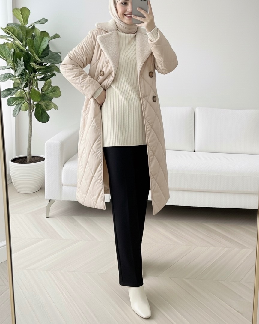 Yakası Kürklü Beli Kemerli Düğmeli Astarlı Kapitone Mont -Taş-Taş