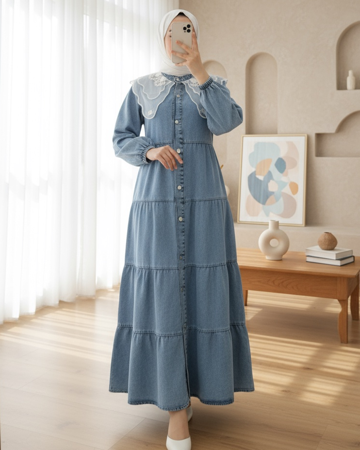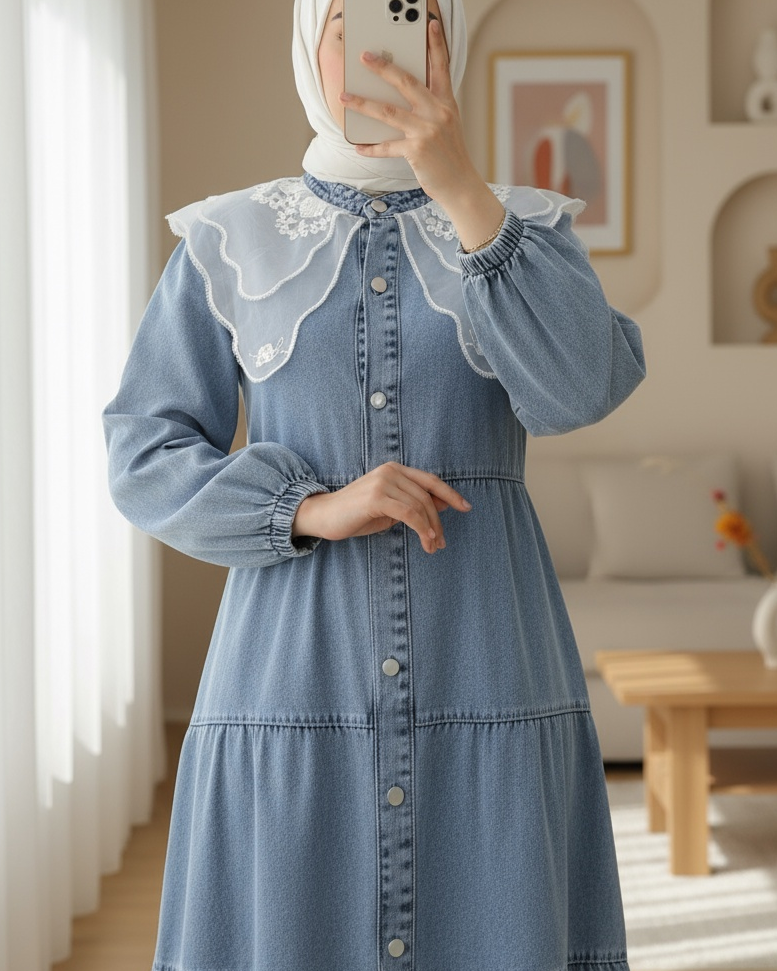 Yakası Organze Tül Detaylı Kot Elbise -Buz Mavi-Buz Mavi