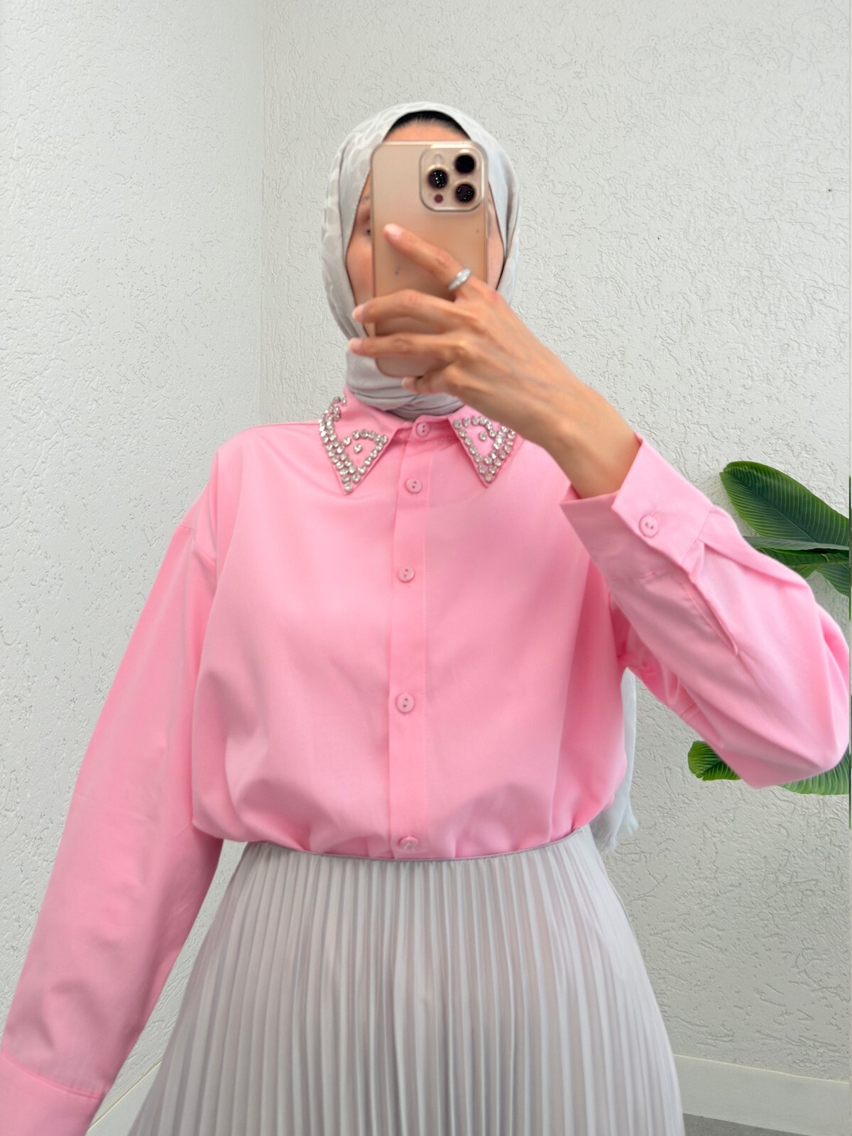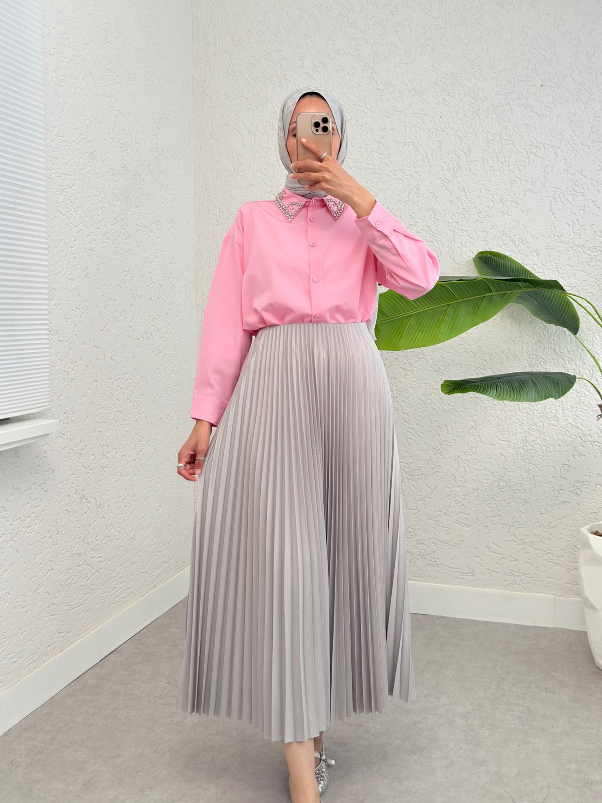 Yakası Taş Detaylı Düğmeli Salaş Gömlek -Pembe-Pembe