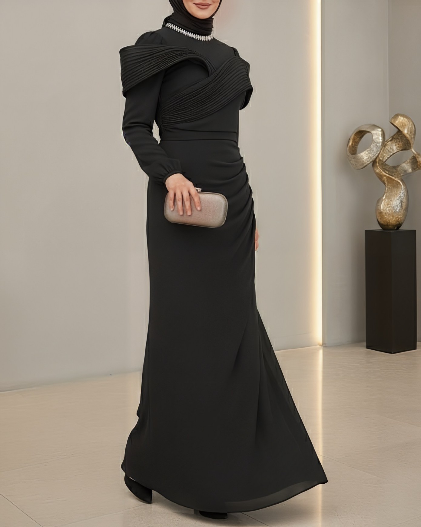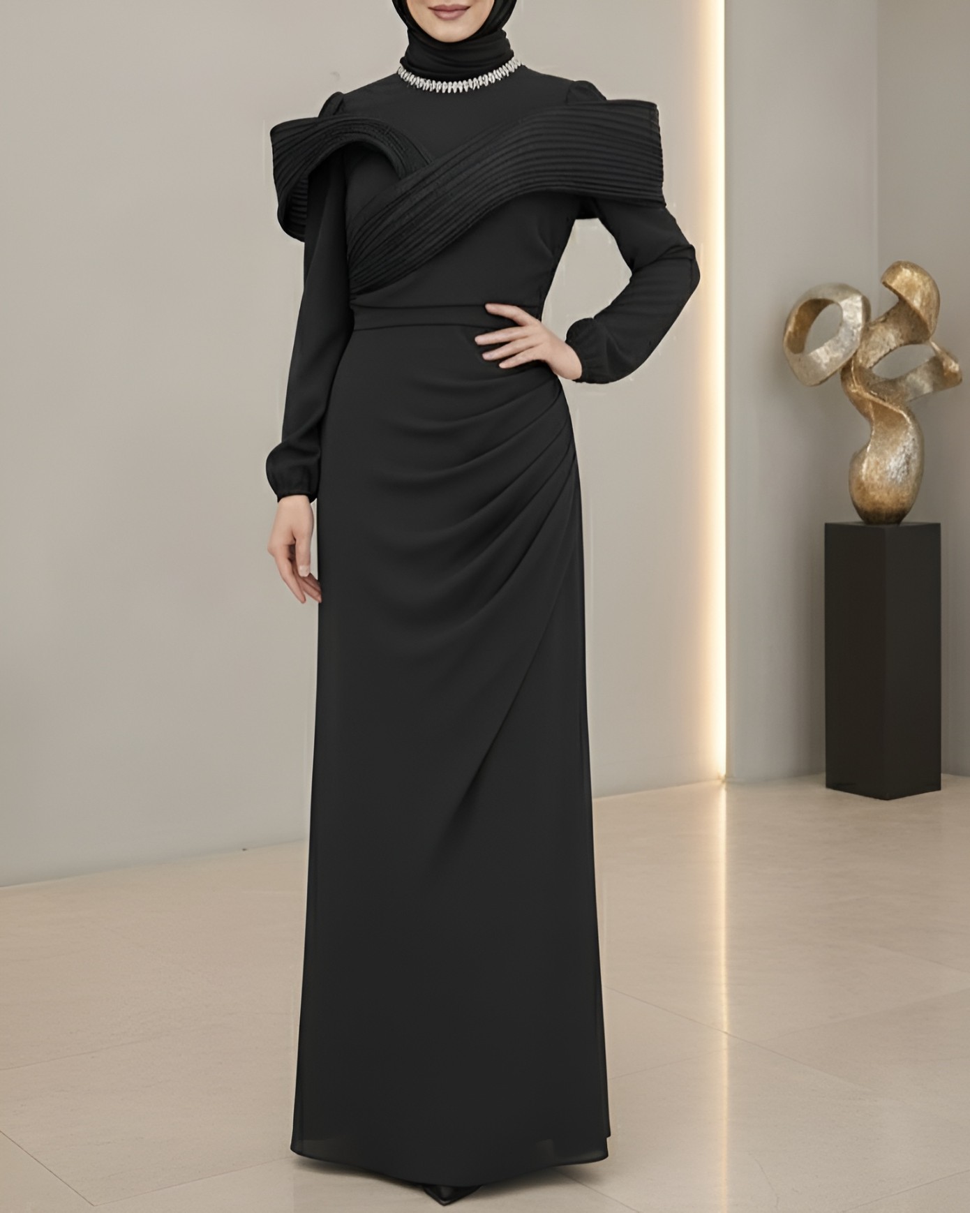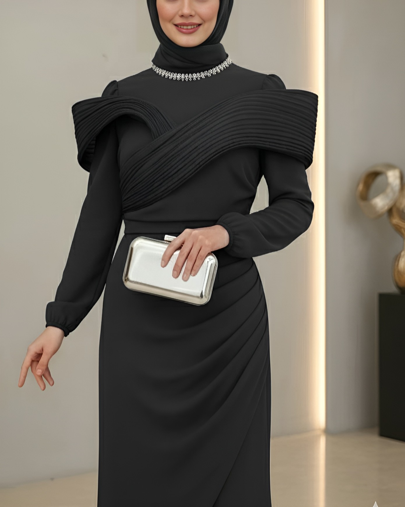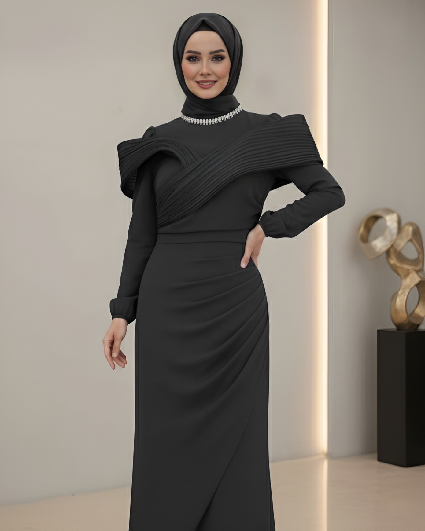 Yakası Taş Detaylı Omuzu Kat Drapeli Abiye -Siyah-siyah