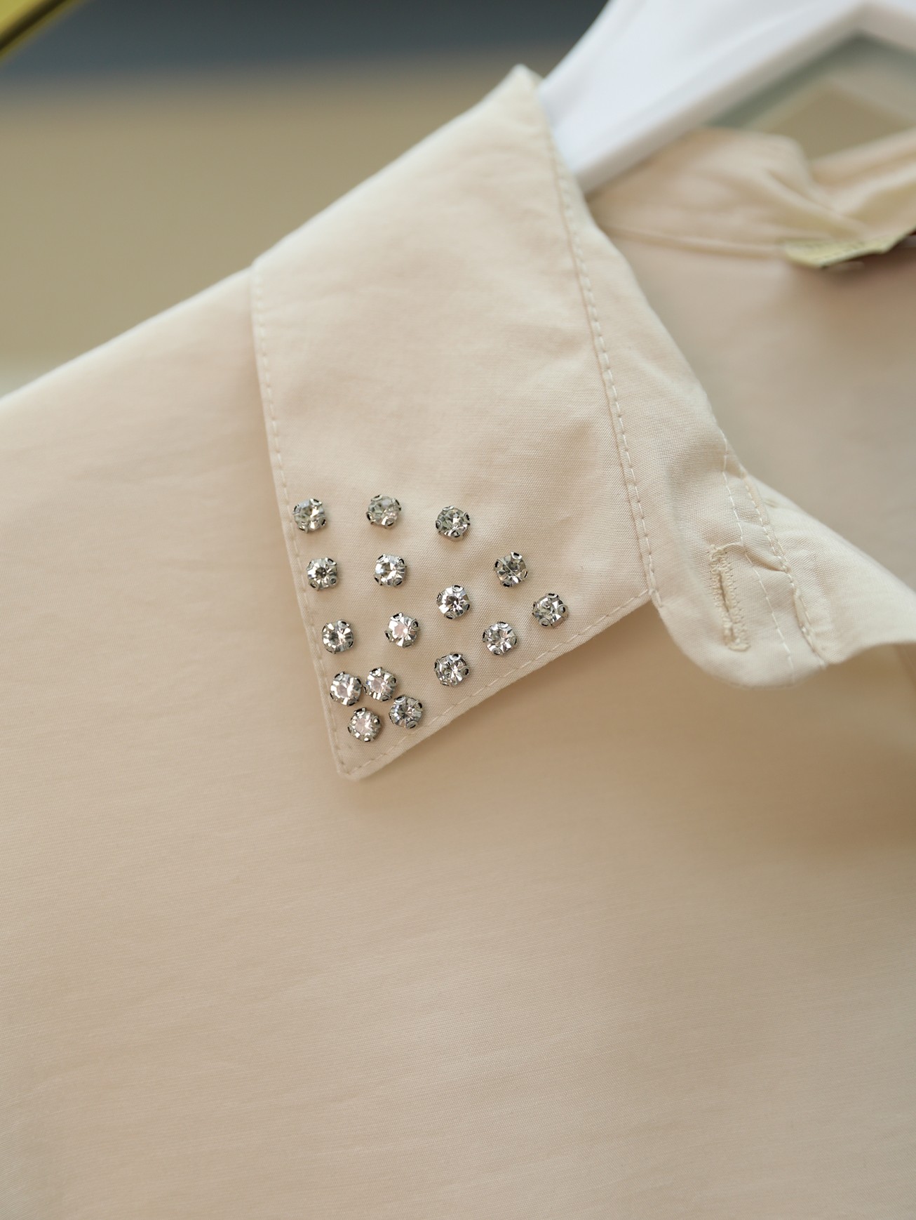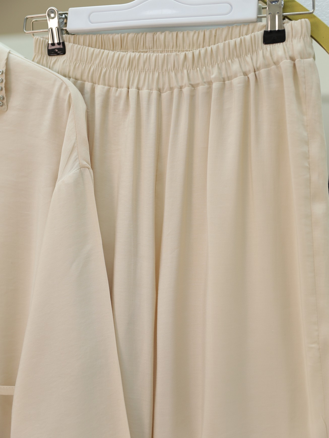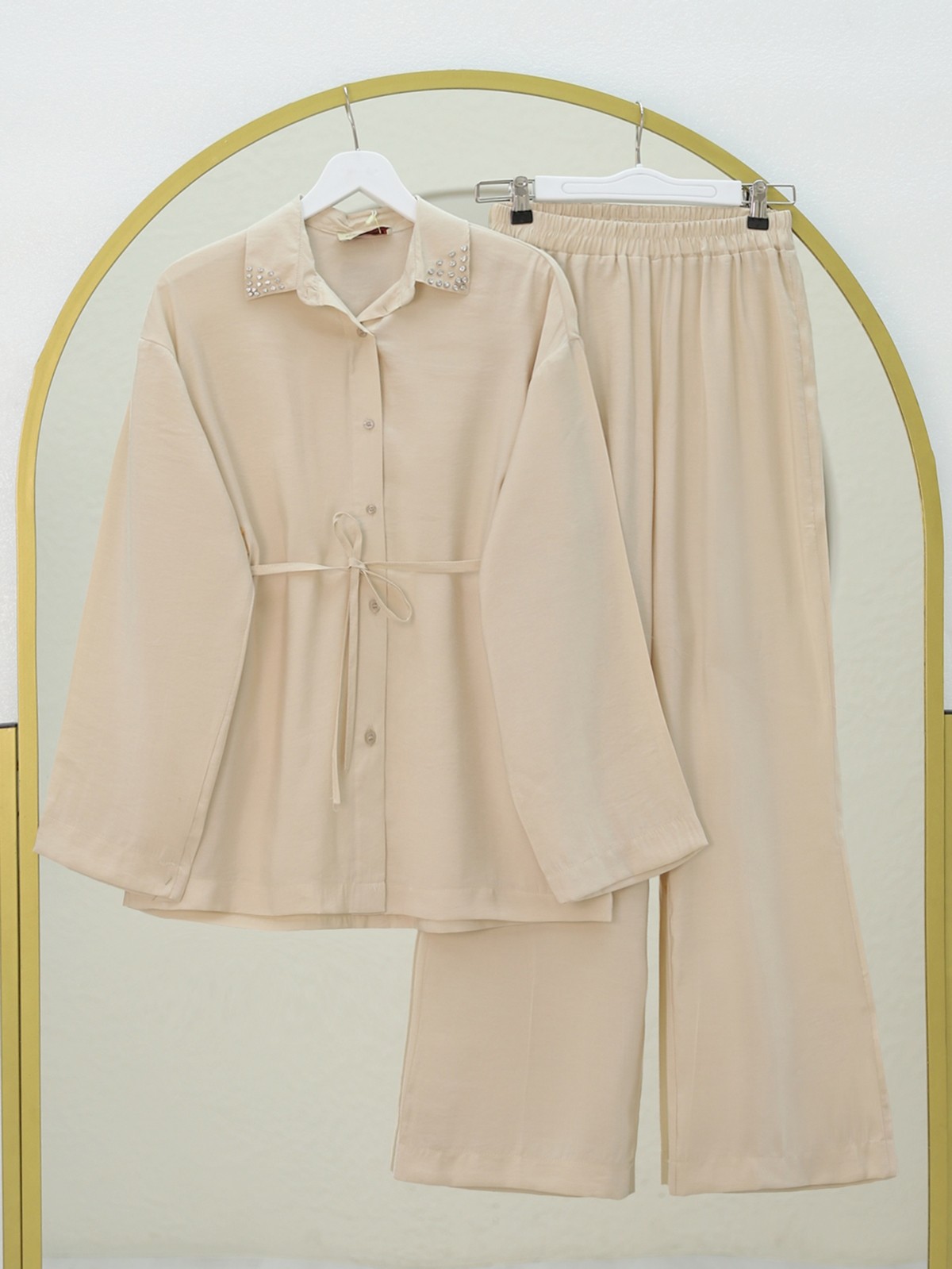 Yakası Taşlı Belden Bağlamalı Pantolonlu Takım -Bej-Bej