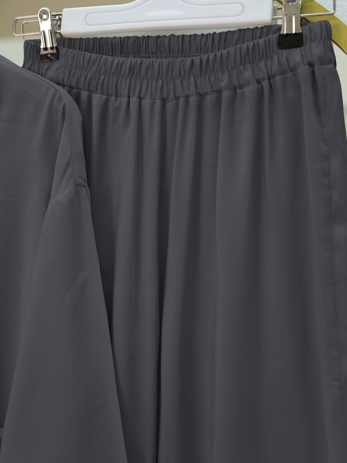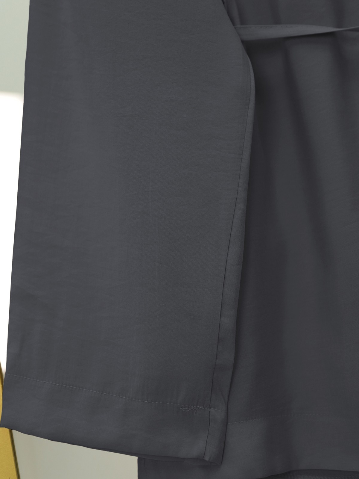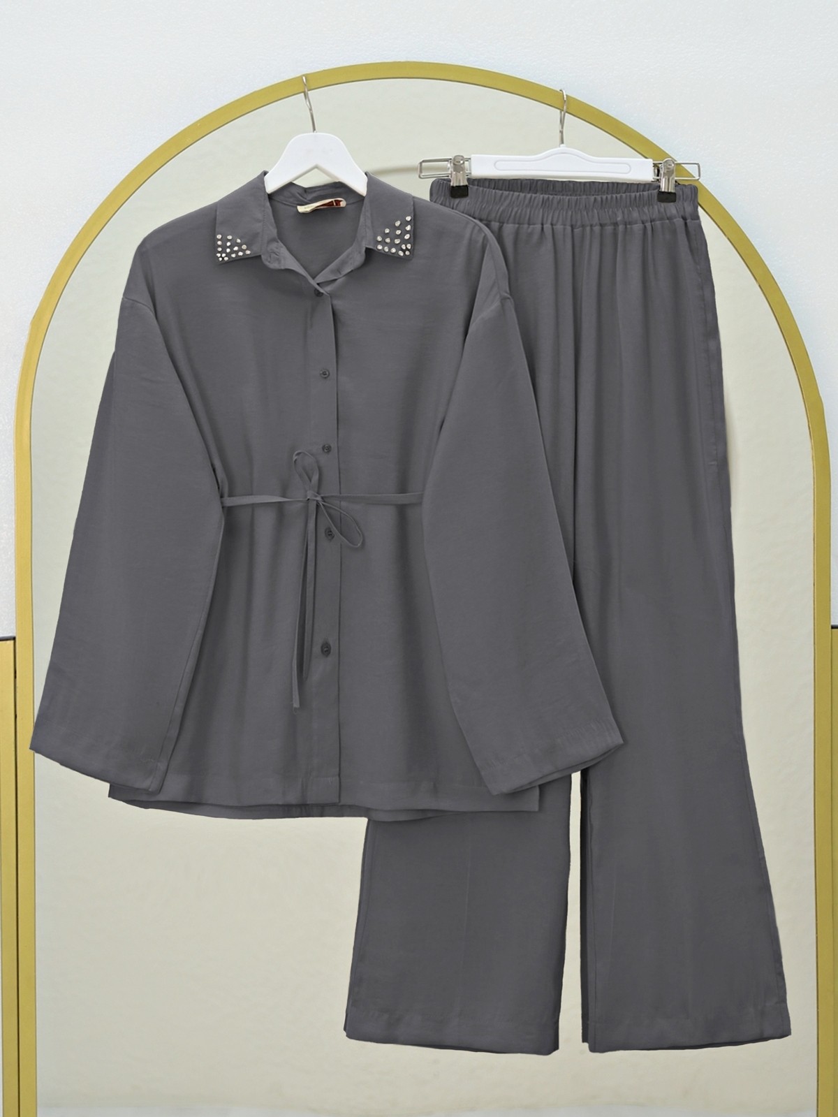 Yakası Taşlı Belden Bağlamalı Pantolonlu Takım -Füme-Füme