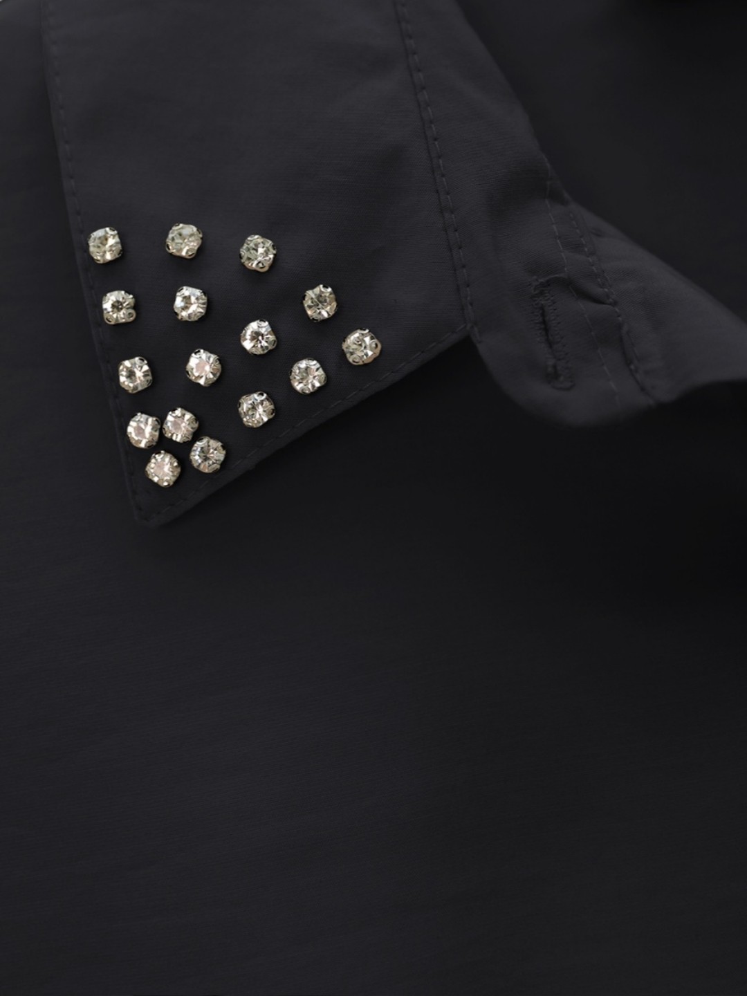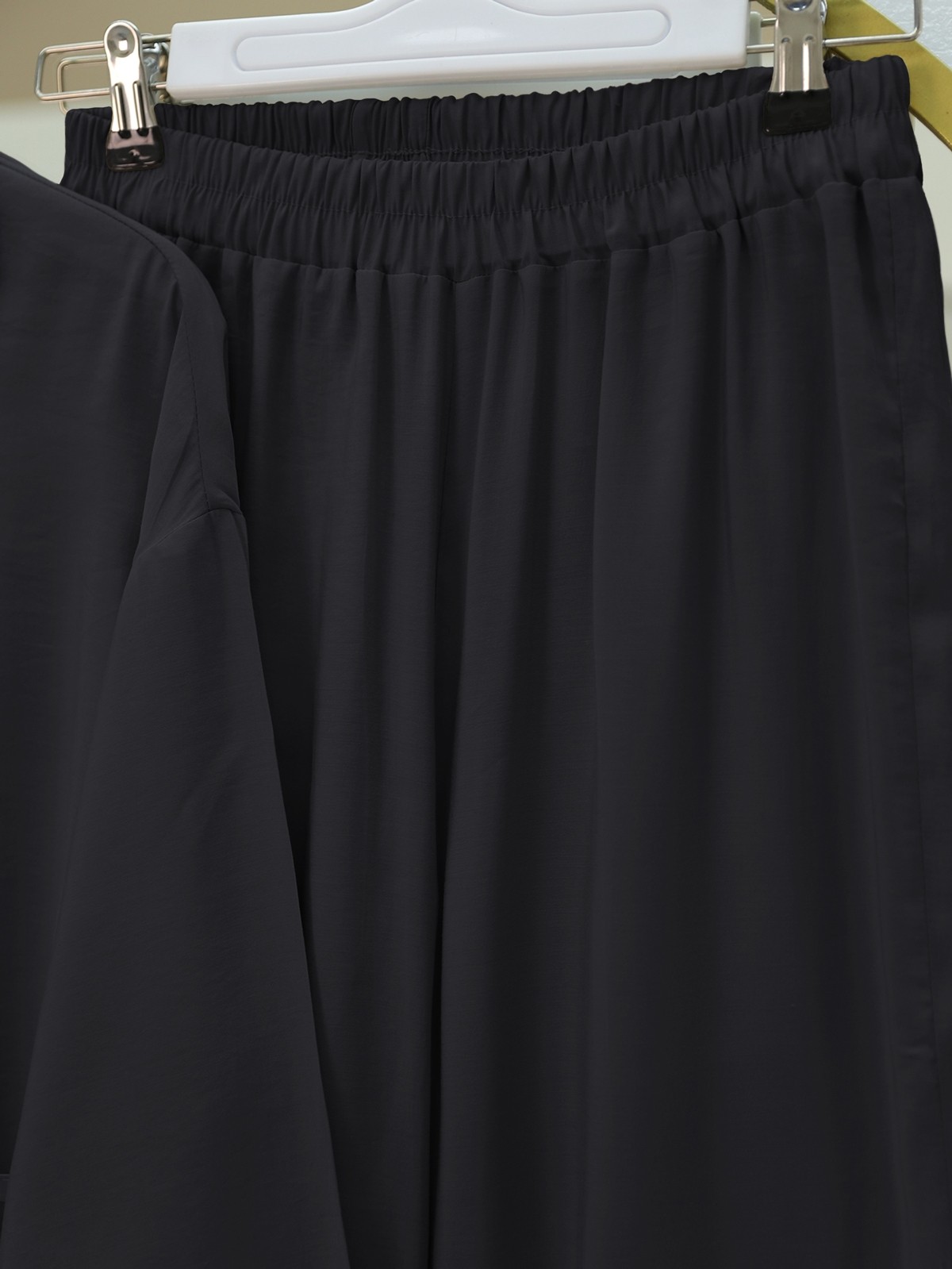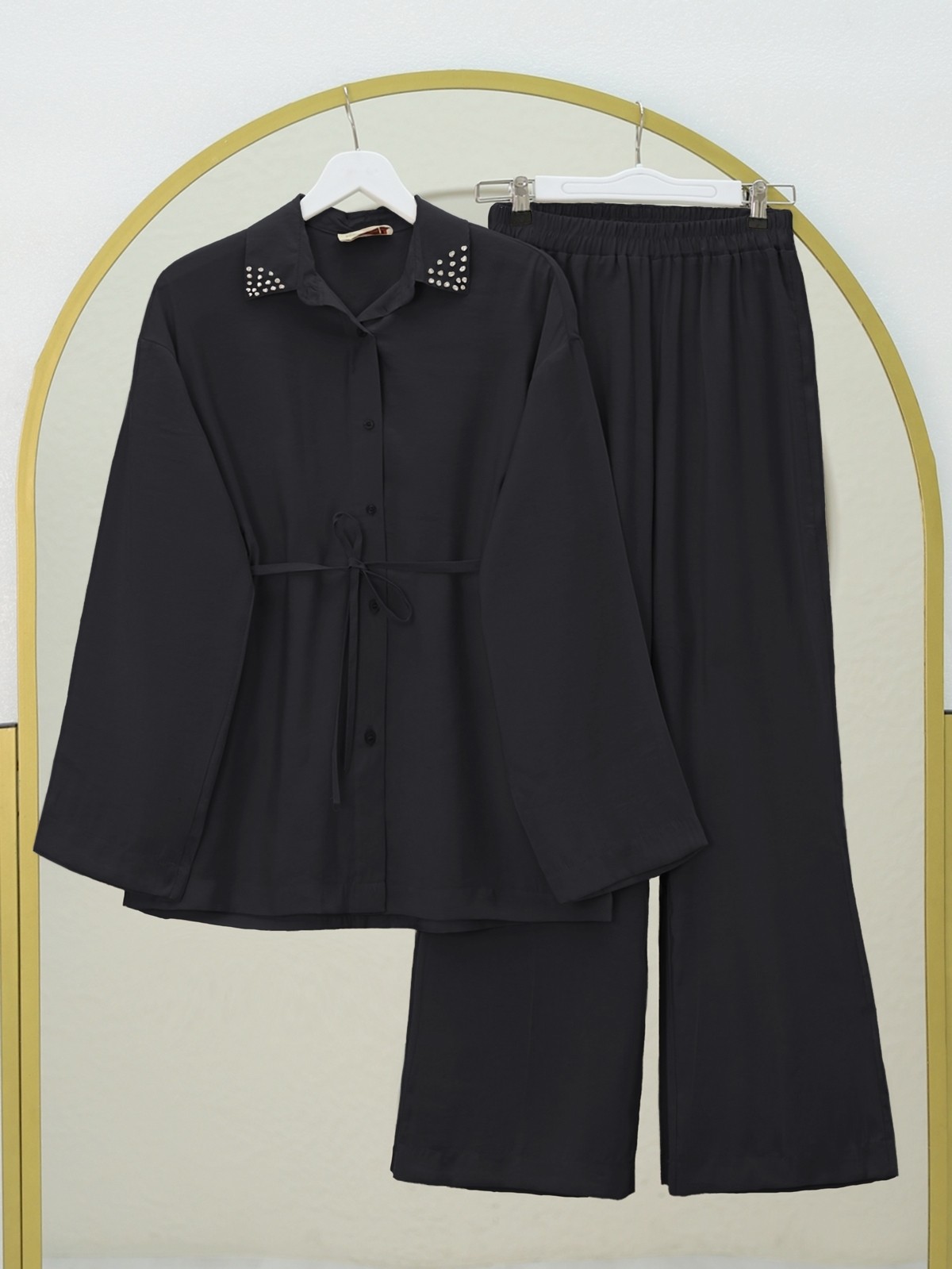 Yakası Taşlı Belden Bağlamalı Pantolonlu Takım -Siyah-siyah