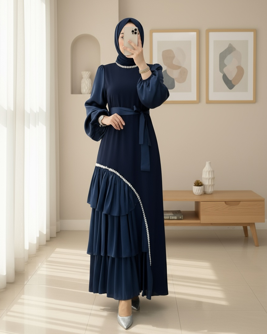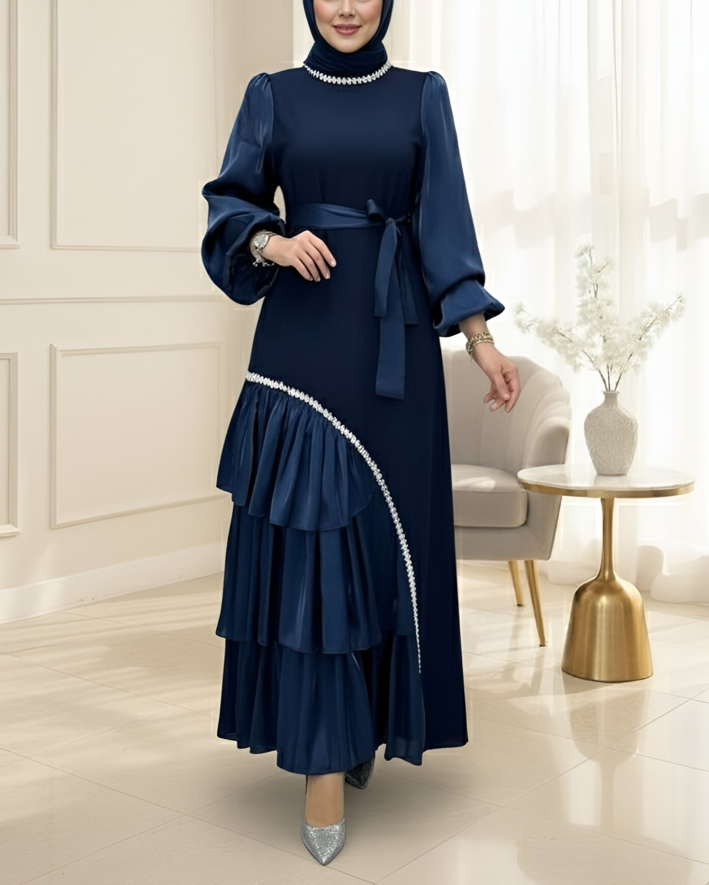 Yakası Ve Eteği Taşlı Kemerli Saten Detaylı Krep Elbise -Laci-Lacivert