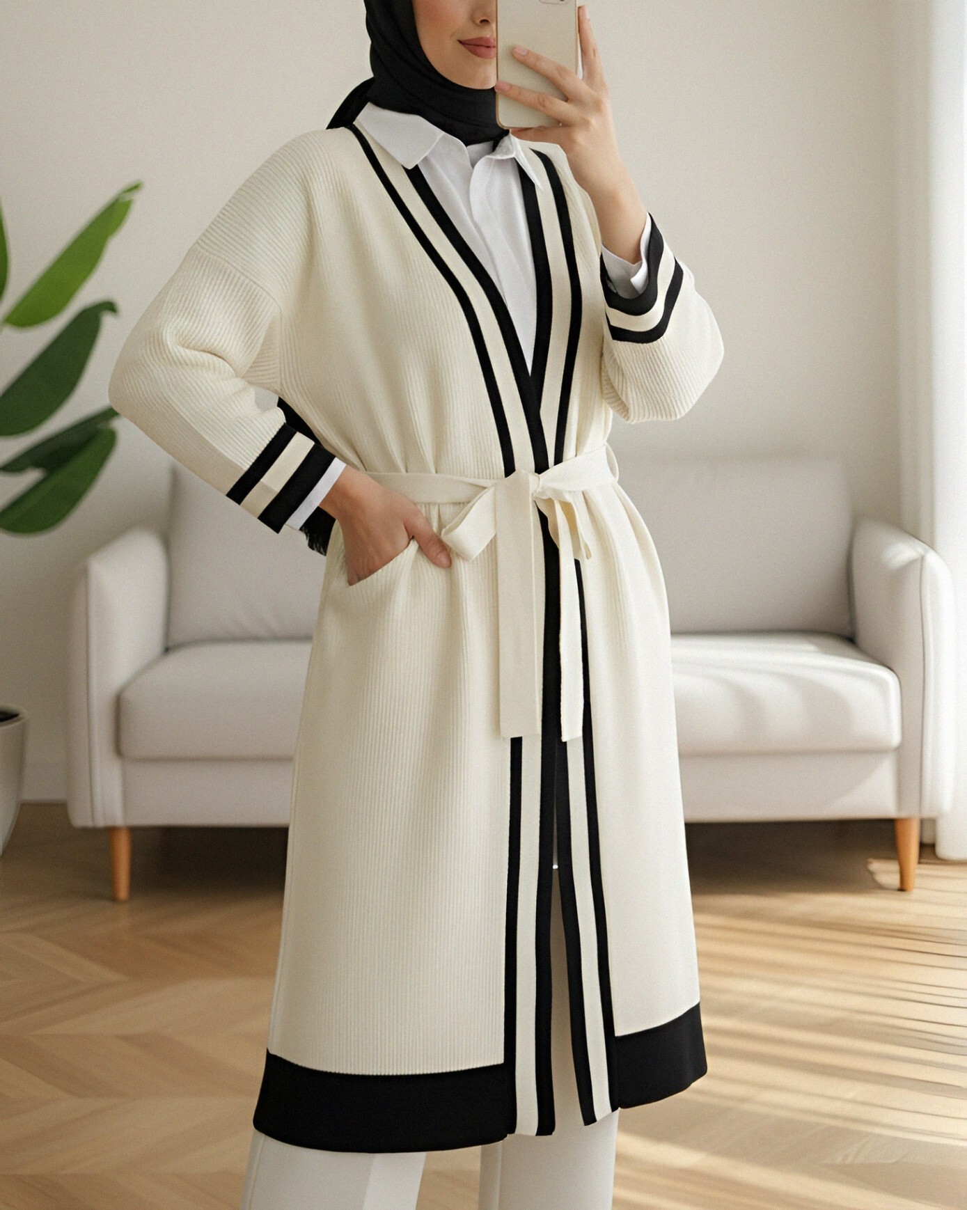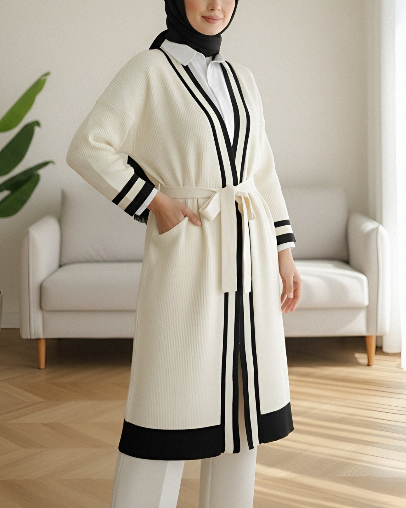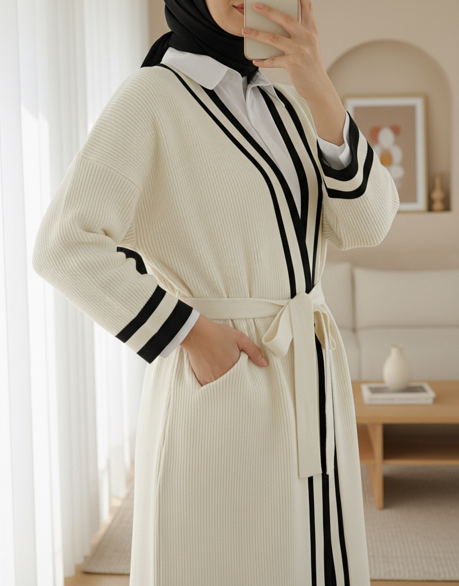 Yakası ve Kol Manşeti Şeritli Triko Hırka -Siyah-Siyah