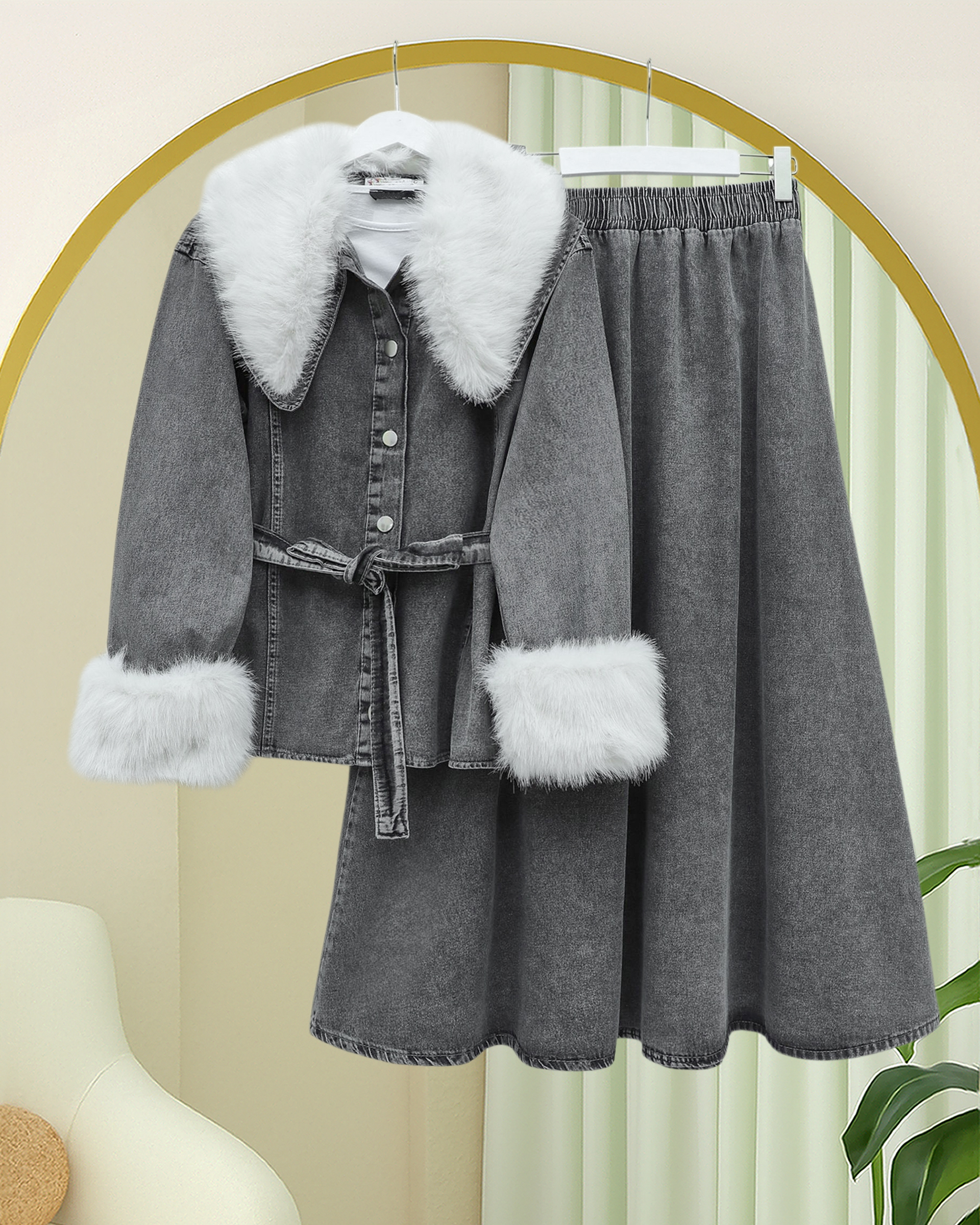 Yakası Ve Kolları Kürklü Beli Kuşaklı Bebe Yaka Kot Takım -Füme-Füme