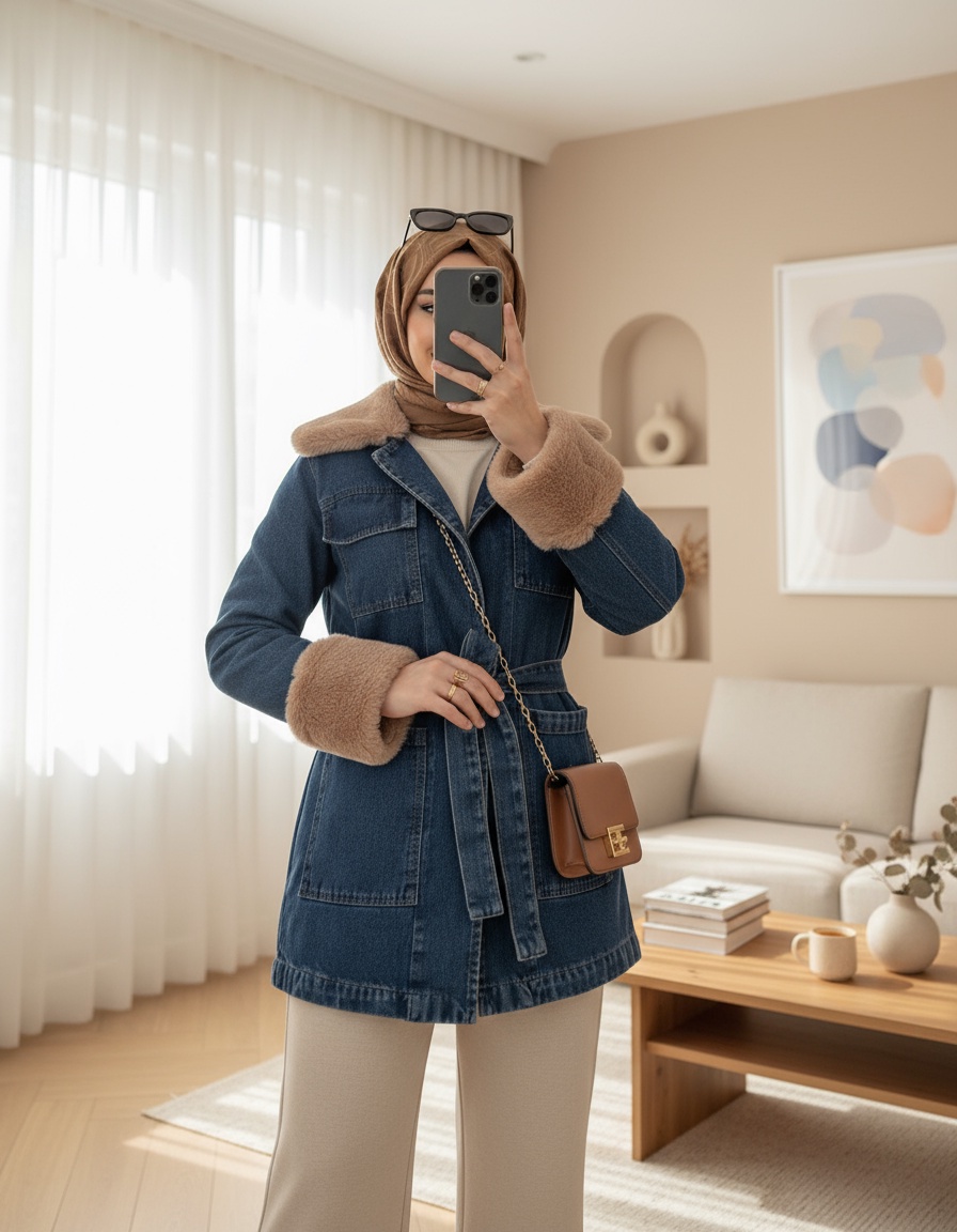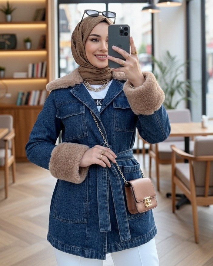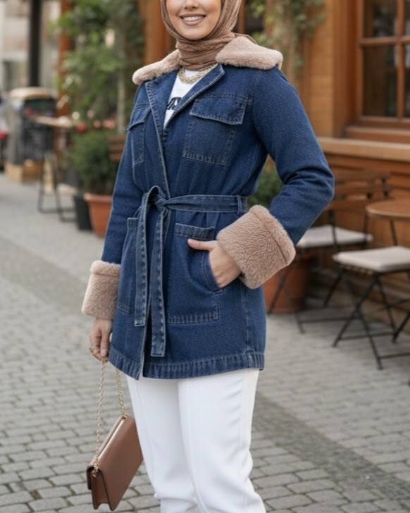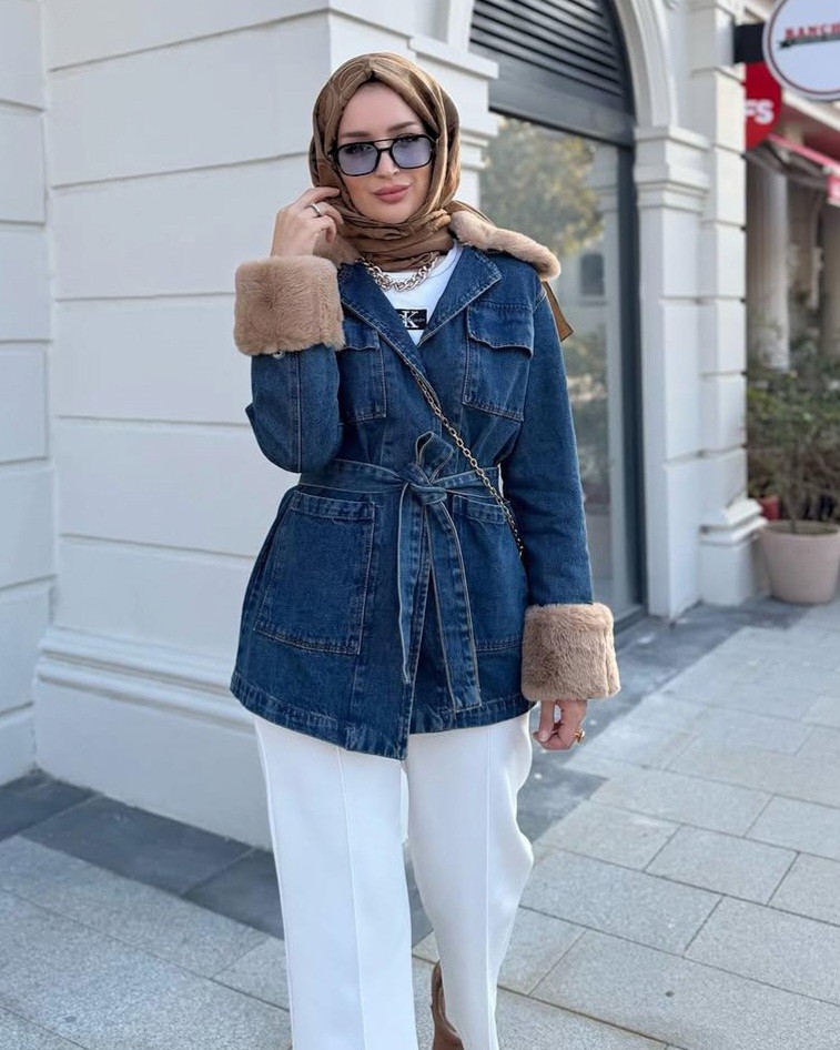 Yakası Ve Kolu Kürklü Önü Bağlamalı Cepli Kot Ceket -İndigo-İndigo