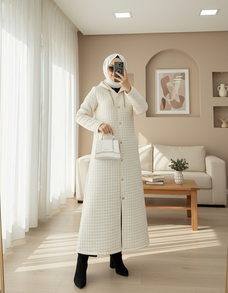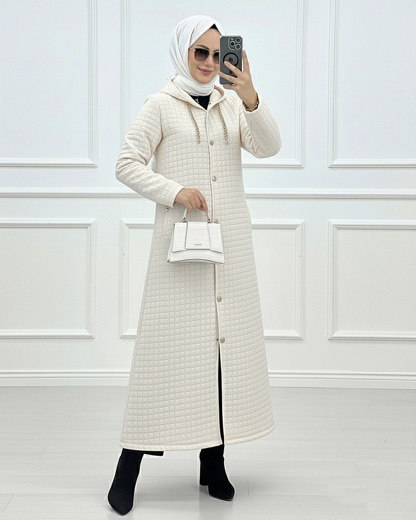 Yakası Zincir Detaylı Uzun Kapitone Kaban -Bej-Bej