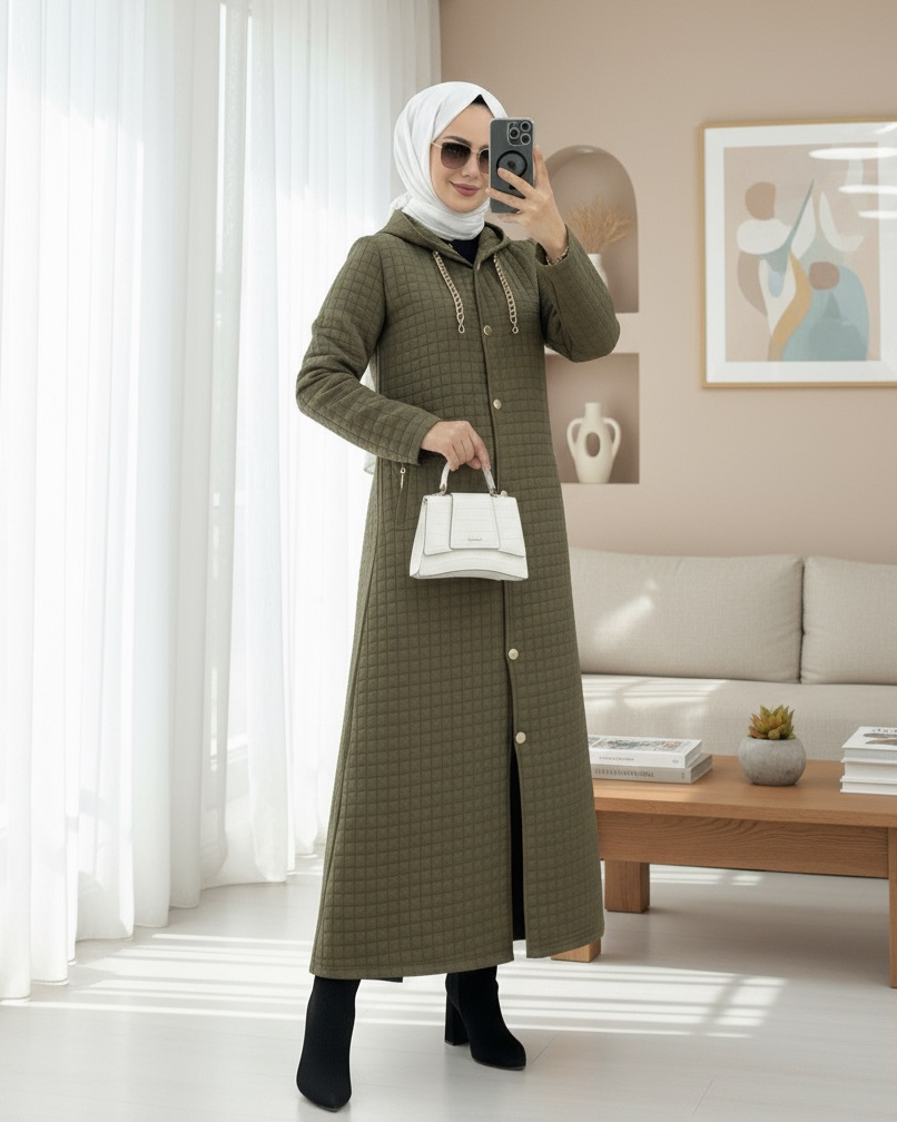Yakası Zincir Detaylı Uzun Kapitone Kaban -Haki-Haki
