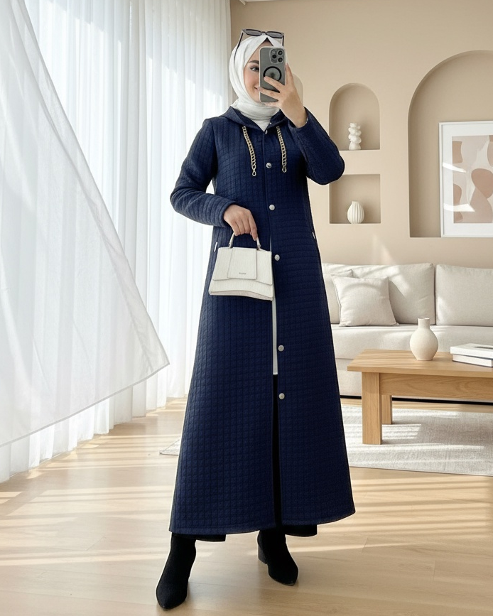 Yakası Zincir Detaylı Uzun Kapitone Kaban -Laci-Lacivert