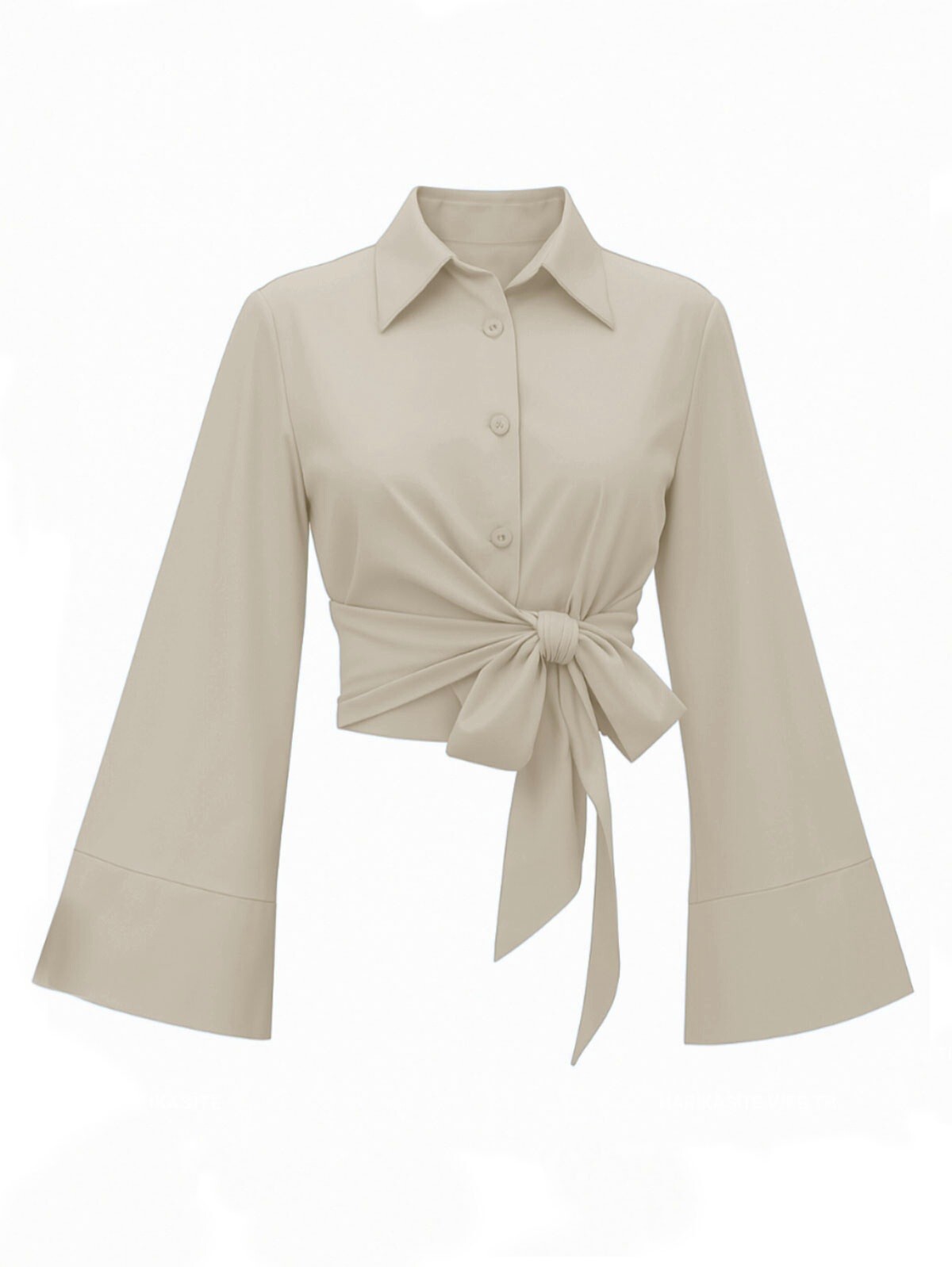 Yan Bağlamalı İspanyol Kol Düğmeli Gömlek -Açık Vizon-Açık Vizon