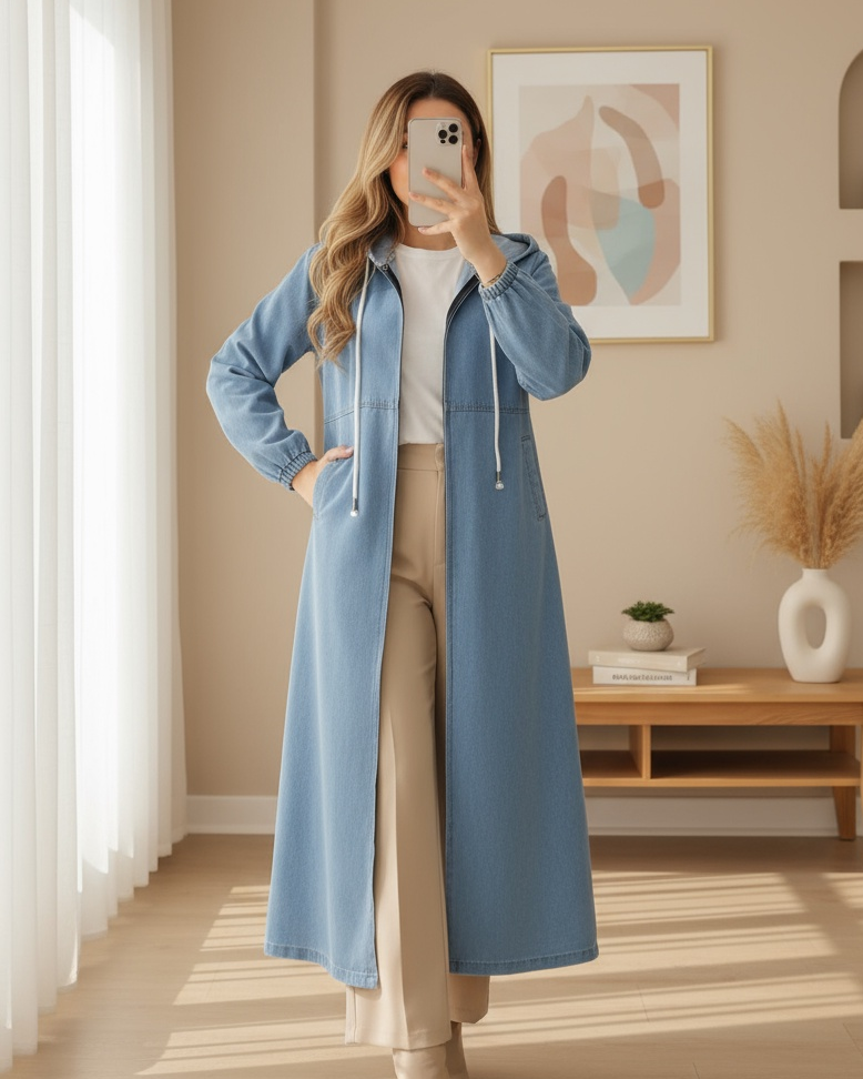 Yan Cepli Kolu Lastikli Kapşonlu Kot Kap -Mavi-Mavi