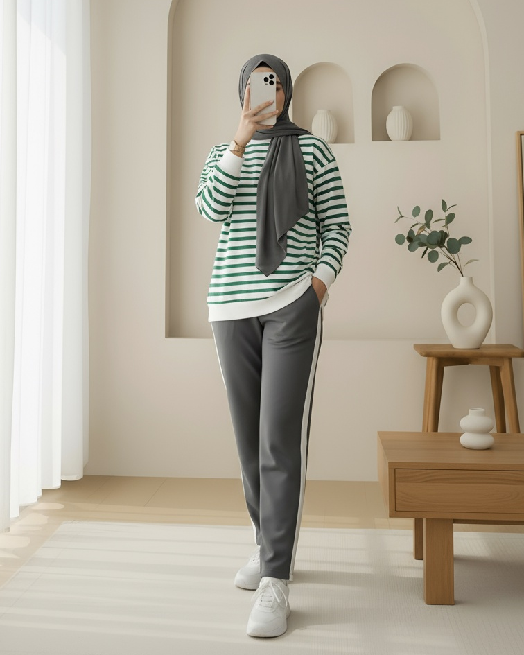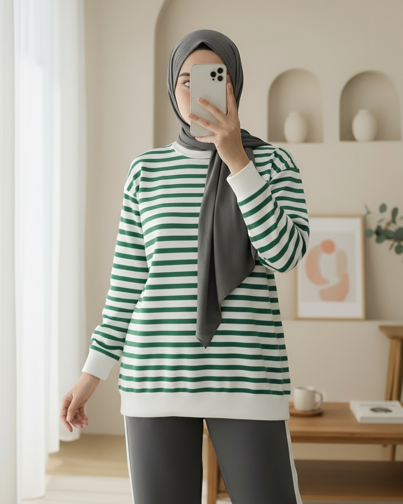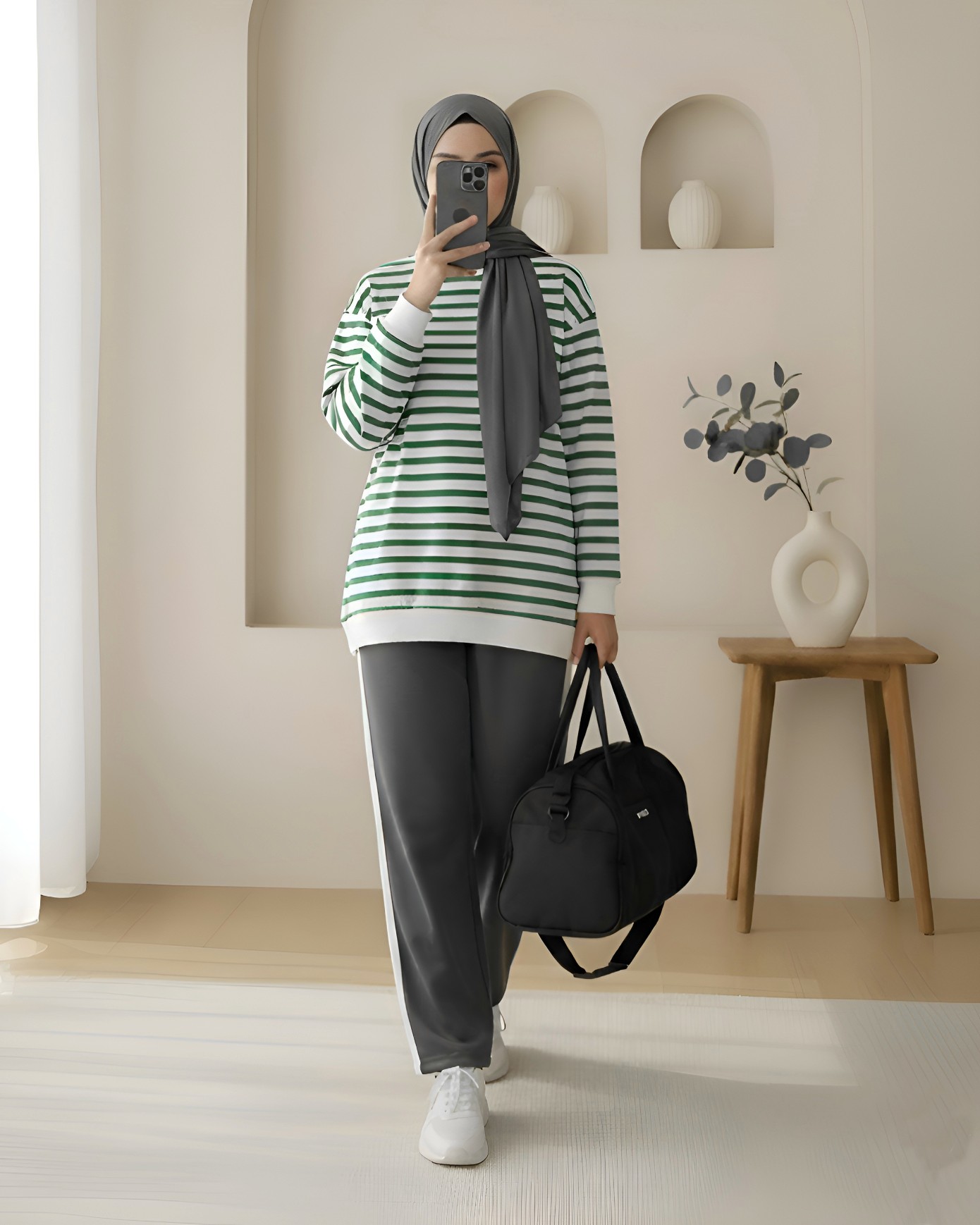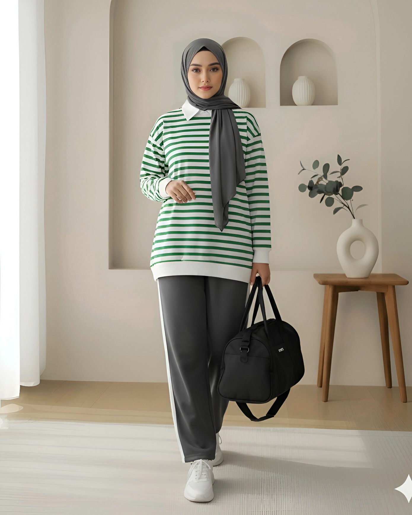Yan Çizgili Bisiklet Yaka Sweat -Zümrüt-Zümrüt