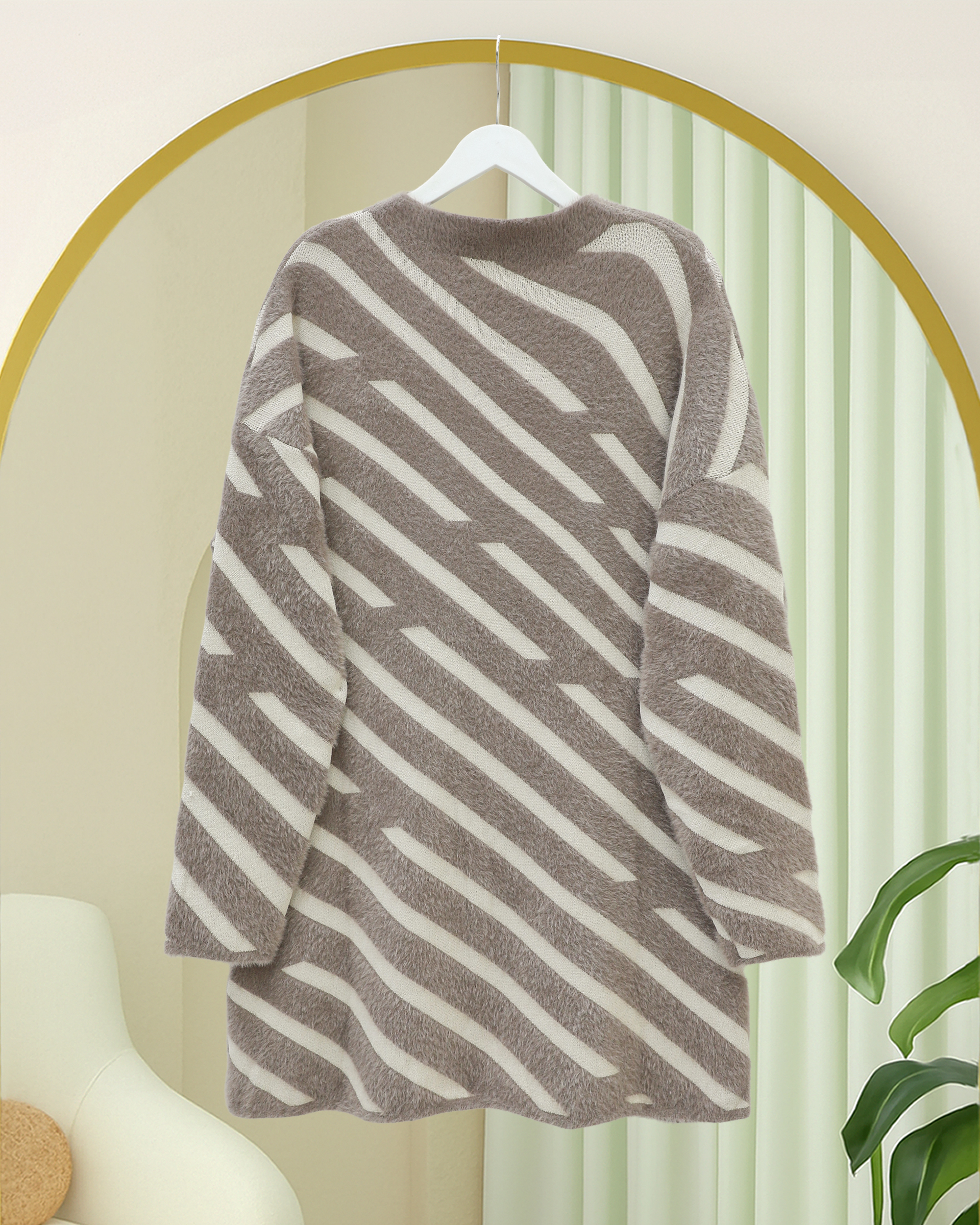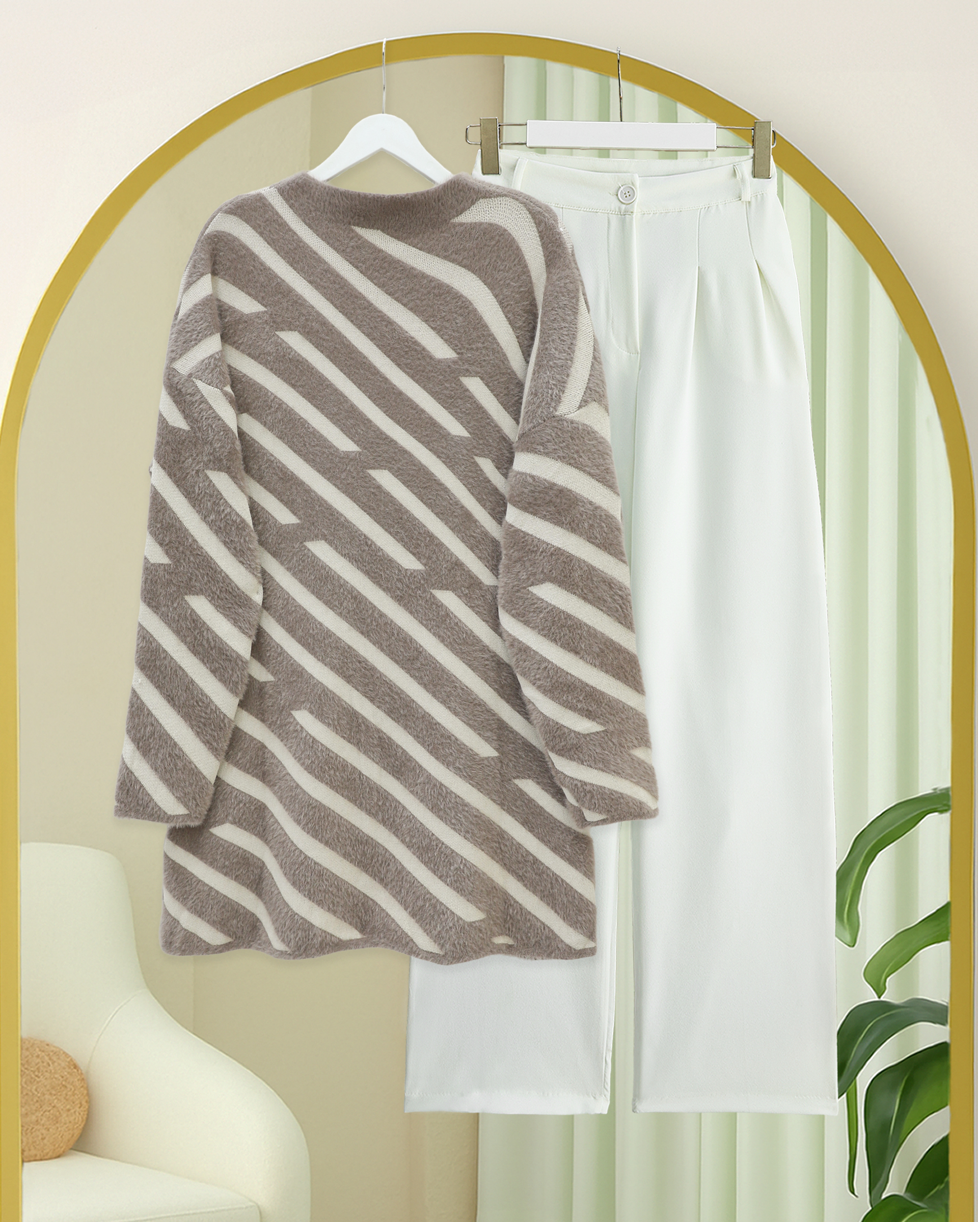 Yan Çizgili Sakallı Salaş Triko Kazak -Toprak-Toprak