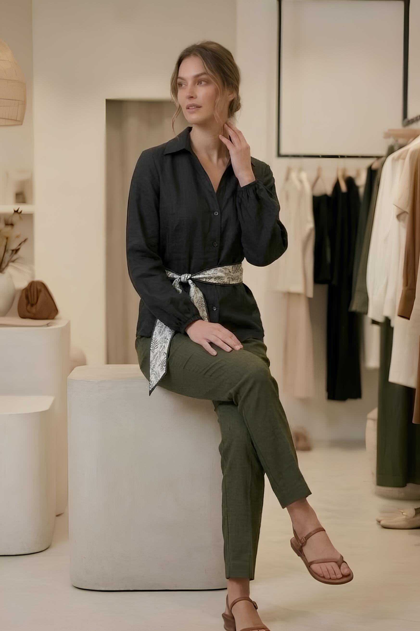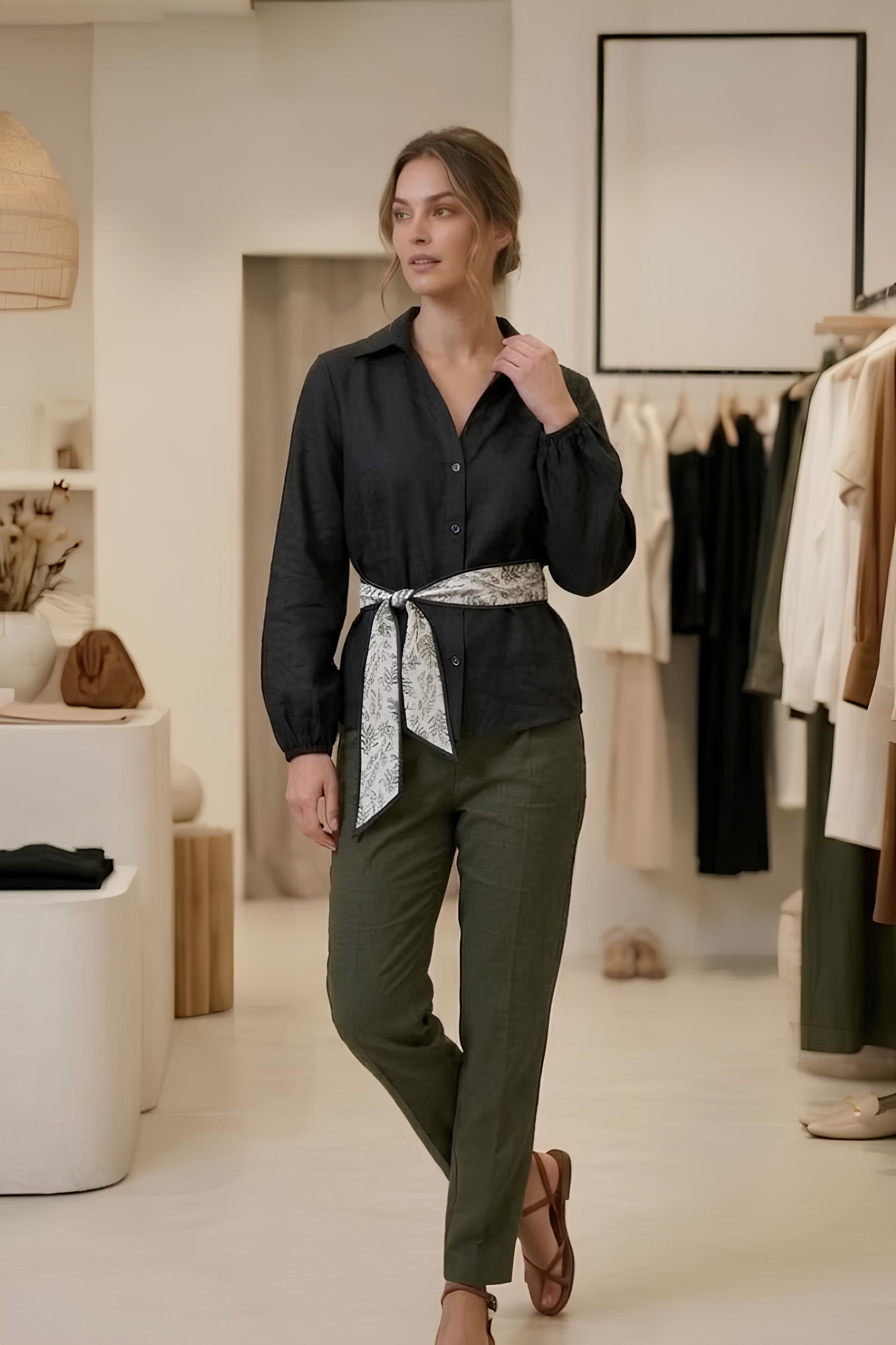 Yan Fular Bağlamalı Keten Gömlek Siyah - 8035-Siyah
