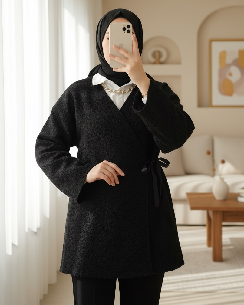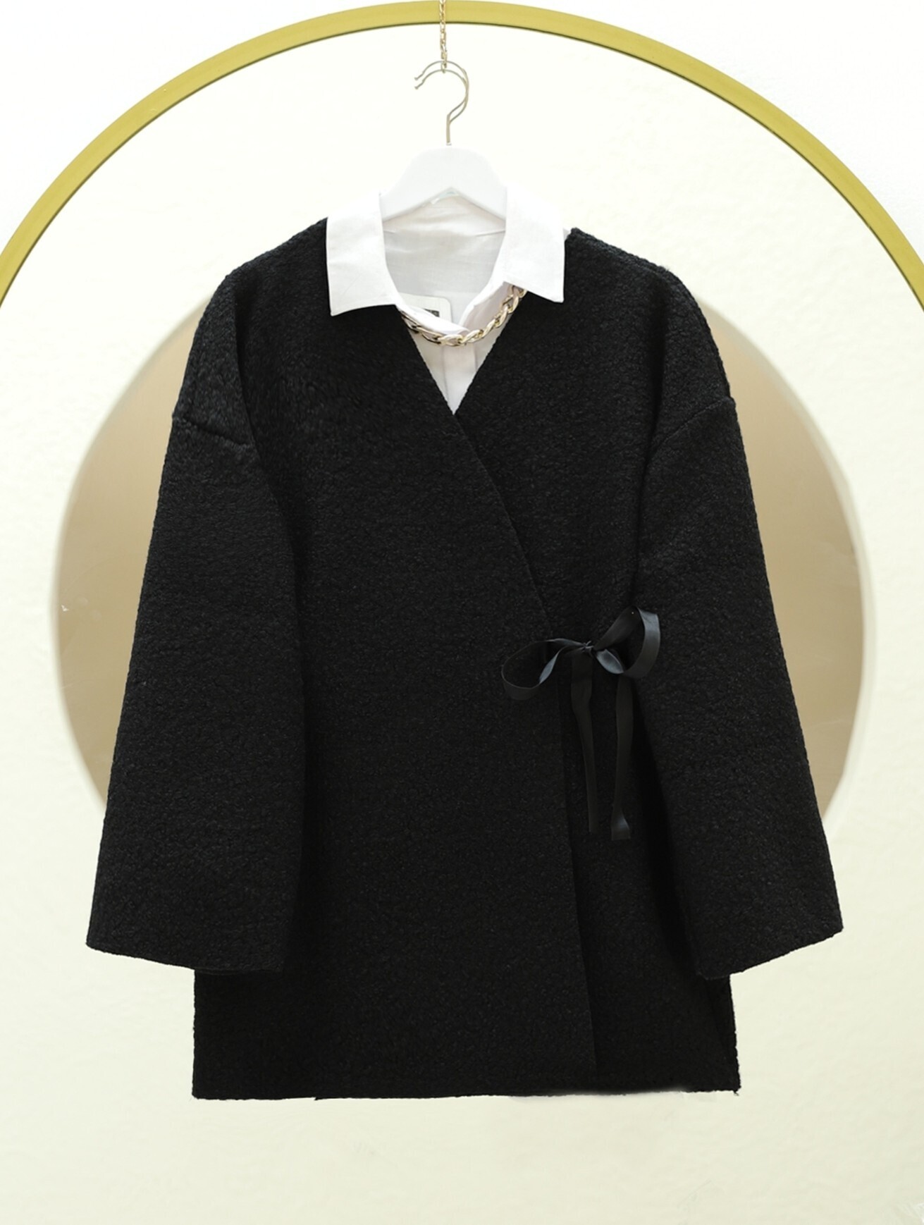 Yandan Bağlamalı Buklet Kimono -Siyah-Siyah